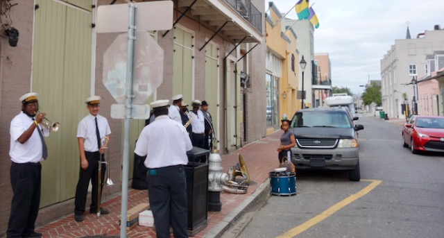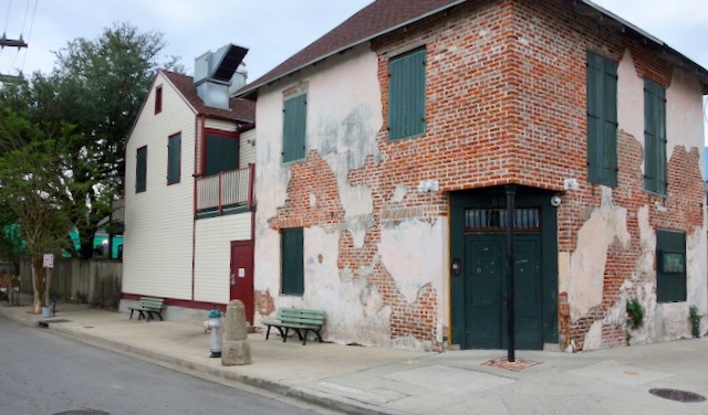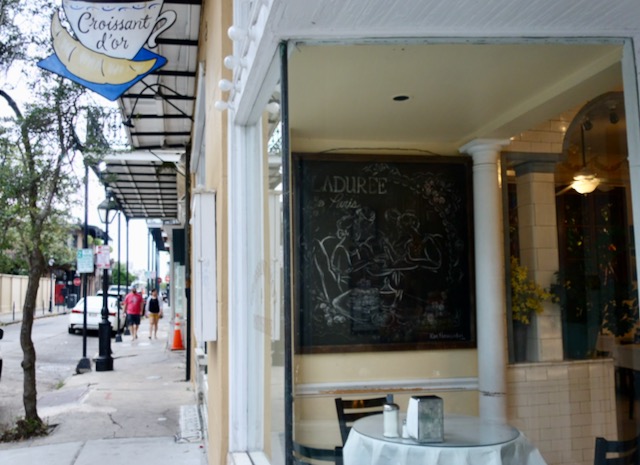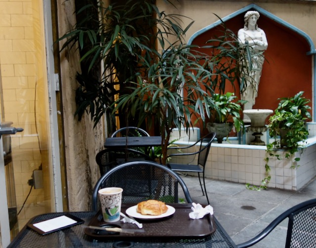 The French Quarter gets less touristy the further downriver one goes from Canal Street. During this month of October I had been bicycling to coffee houses all over New Orleans searching for the perfect croissant. Disappointingly, nowhere in New Orleans had a croissant as crispy as those at Foster Street Coffee in Durham NC. The Croissant D’or on Ursulines Avenue in the lower French Quarter came close, and it was nice to sit in its courtyard eating my croissant with an almond milk latte, one pack sugar.