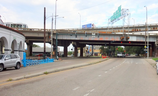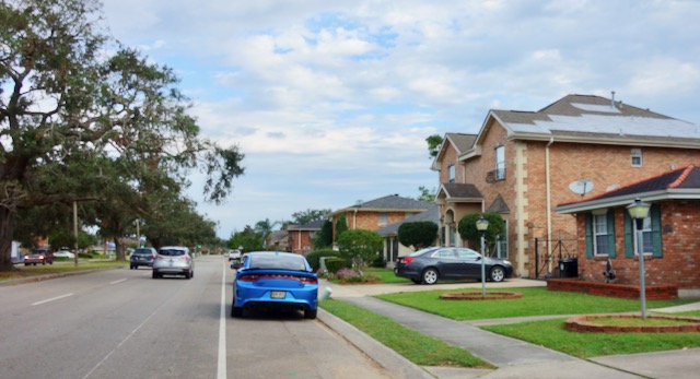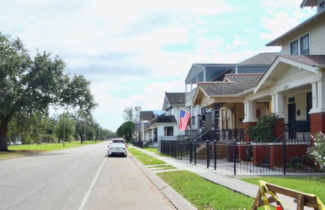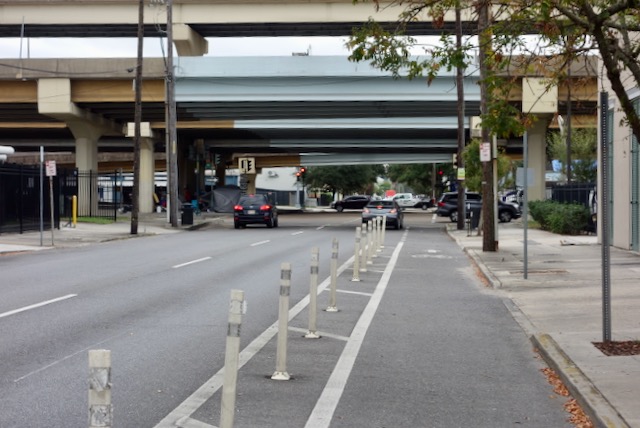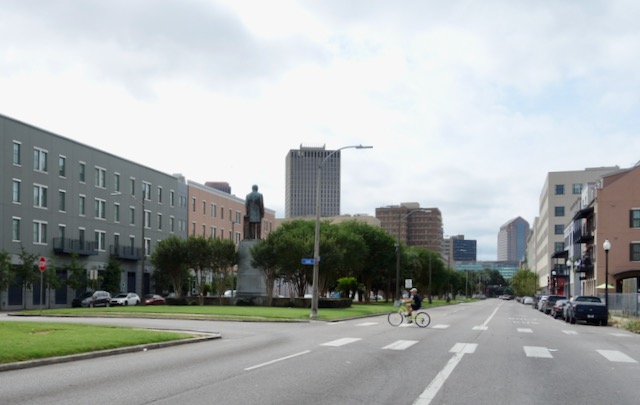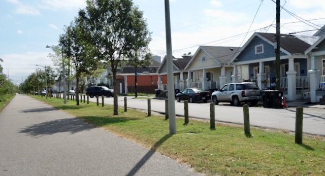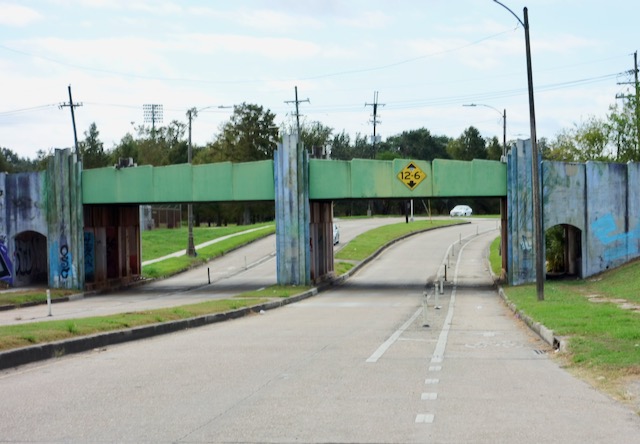 There are current serious proposals to tear down this section of I-10, but as with most such things, it is complicated. Meanwhile, I cycled under the freeway and resumed cycling on St. Bernard Avenue, which is wide and relatively safe for bicycling. St. Bernard Avenue continues for five miles, all the way out to the Lake Ponchartrain lakefront. The further from downtown one gets the newer the buildings become.