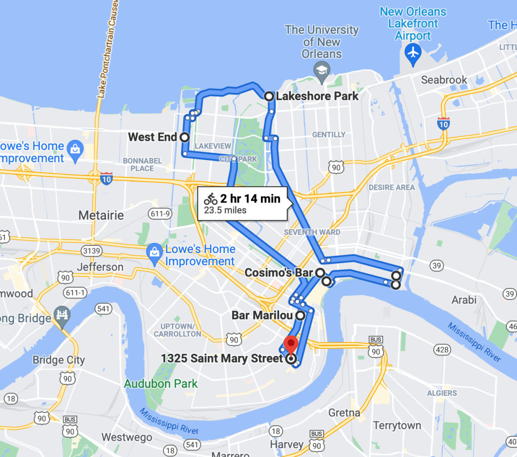 Directions in the older parts of New Orleans make little sense speaking north or south. They are better described as upriver (uptown) or downriver (downtown). Cross streets go towards the river or away from the river. The three or four hour bike ride I took shown below covered a large portion of New Orleans but by chance mostly excluded Uptown. Other than the French Quarter, Uptown is the area most visitors think of when visiting New Orleans. It is the area in the bottom left on the map below, between Saint Mary Street and Audubon Park. Tulane University is next to Audubon Park. I cycle through Uptown frequently, just did not on this particular day.