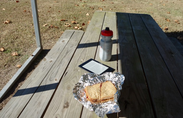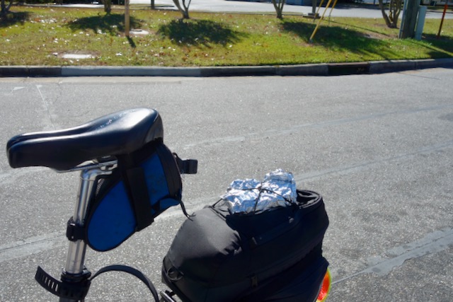 I did not have room on the back of my bicycle for my peanut butter and jelly sandwich so I strapped it in its foil wrapping onto the top of my trunk bag.