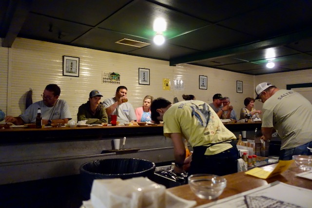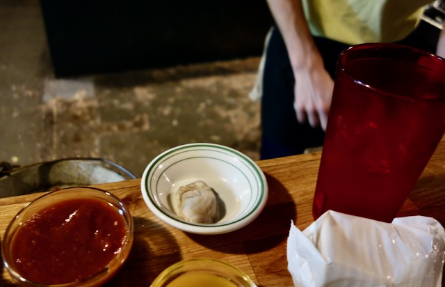 Oyster styles are regional. The most popular oyster here was “steamed,” similar to what in Virginia Beach we called “roasted.” I have lived in and visited New Orleans on and off for years and in New Orleans I have never heard of roasting or steaming in-shell oysters. Here in Williamston the unshelled oysters are put in a large steaming device and when you order they ask how much you want them cooked. I chose lightly steamed. They were opened hot by the shucker as he stood in front of me, putting each oyster in the same small dish as I ate them.
