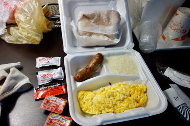 After my COVID chance-taking the night before I had no interest in crowding into the mask-less dining room. I got my breakfast to-go and ran back across both highways to my motel room.