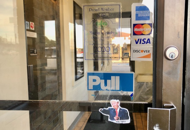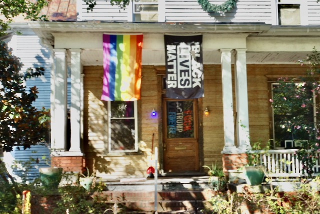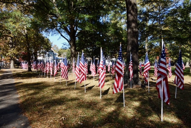 Tarboro has a “Common,” a downtown park that the locals will tell you that is the only Common in the USA other than Boston. Veterans Day was just around the corner and there was an American flag thing going. Tarboro is likely a very conservative place, so I guess when one is anti-Trump one needs to shout it out.
