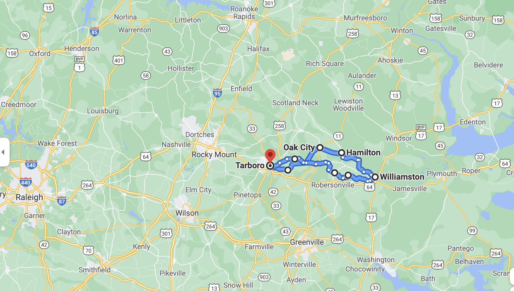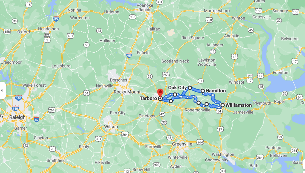 I cycled through Tarboro’s downtown and onward east towards Williamston. Here is the loop I rode over two days.