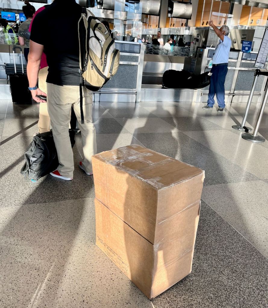 There’s a new airline called Avelo with hubs in Burbank CA and New Haven CT. They now fly nonstop from Raleigh/Durham to New Haven. It would be an easy way start bicycling in the cooler weather and interesting scenery of New England, a region I have always found exotic. I had a general idea to bicycle north along the Connecticut River up into Massachusetts, before cycling back towards my brother Alex’s apartment in Brooklyn NY. Flying with the folding Bike Friday on the airplane, for this trip I eschewed my usual suitcase and used a cardboard box that I could throw away after landing. I planned to return home on Amtrak, on which the folding bike needs no packing. I stood in line at RDU on a Sunday morning.