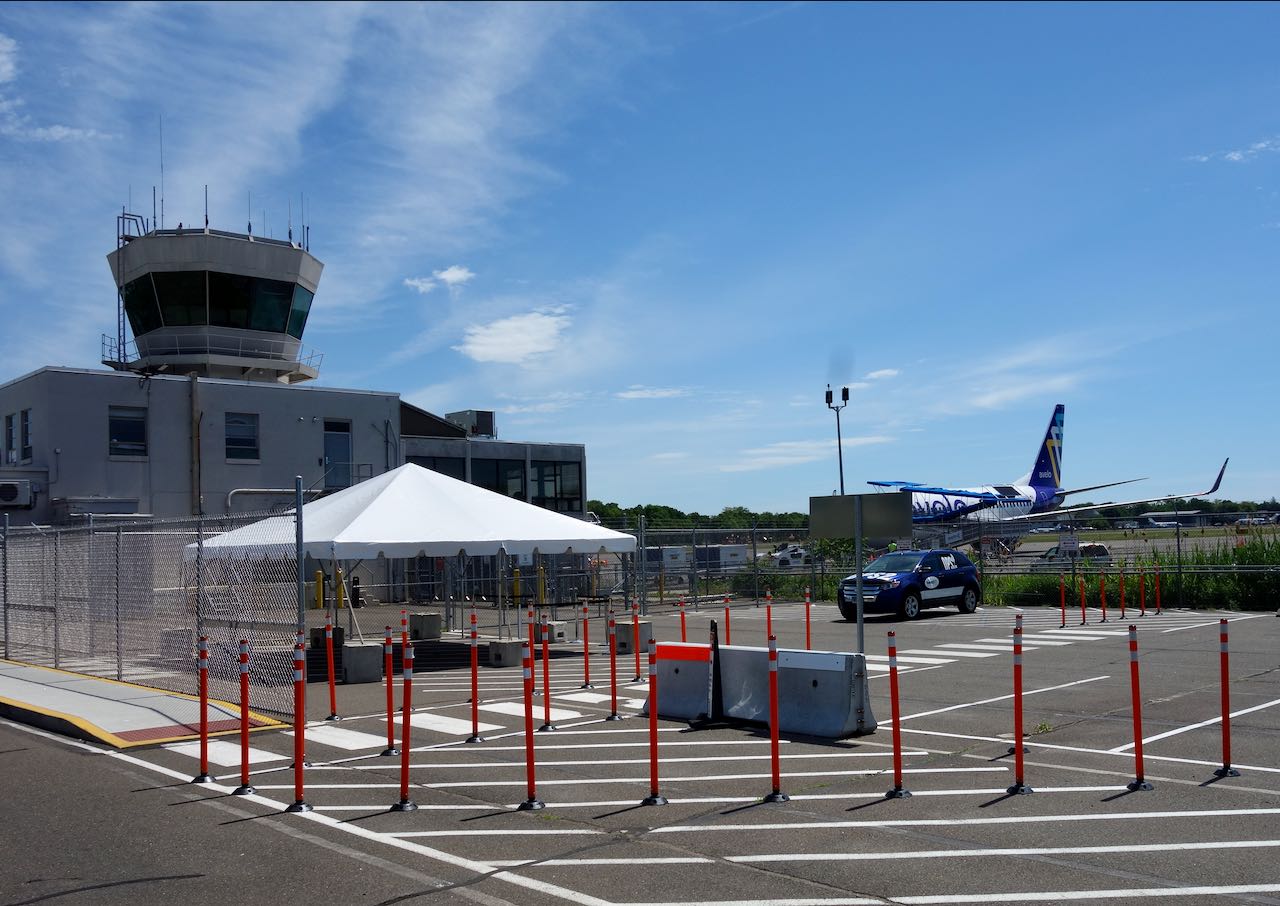 Downtown New Haven is about six miles north of the airport. Bicycling from the airport was safe and pleasant as a normal suburban neighborhood comes practically up to the runway.