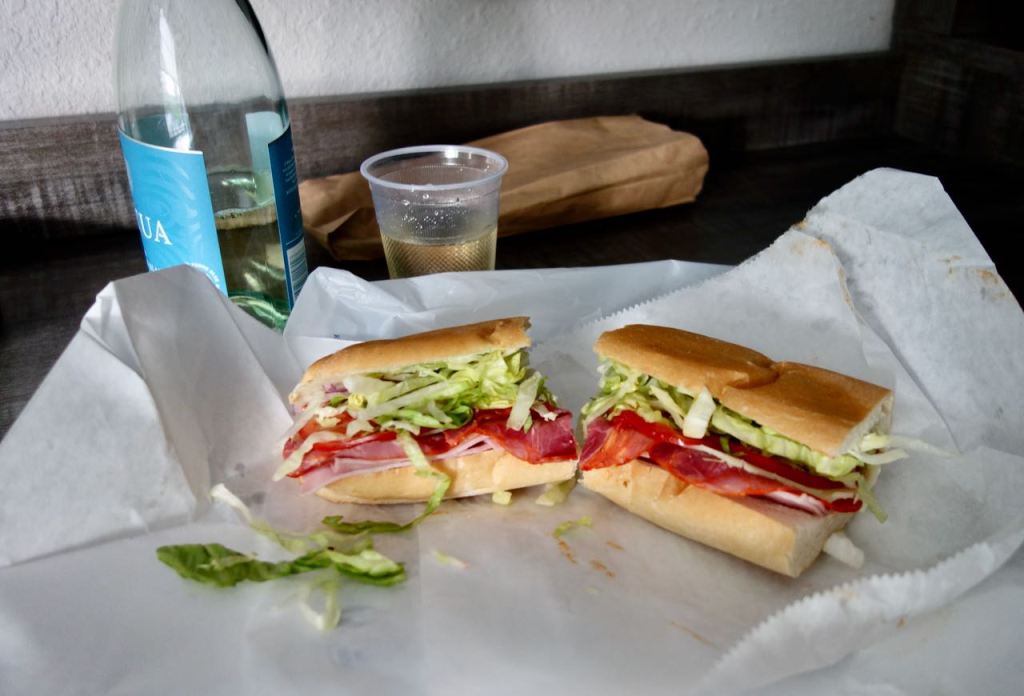 What to do for dinner? There was no real restaurant within walking or even short bicycling distance of the Hampton Inn. One mile away on a dicey bike ride on a highway was Alessio’s Pizza & Pasta. I ordered the kind of sandwich that chains like Subway and Jersey Mike’s have tried to imitate. Alessio’s tasted like the real deal. I bicycled with it back to the motel room and enjoyed it with some of my to-go bottle of wine.
