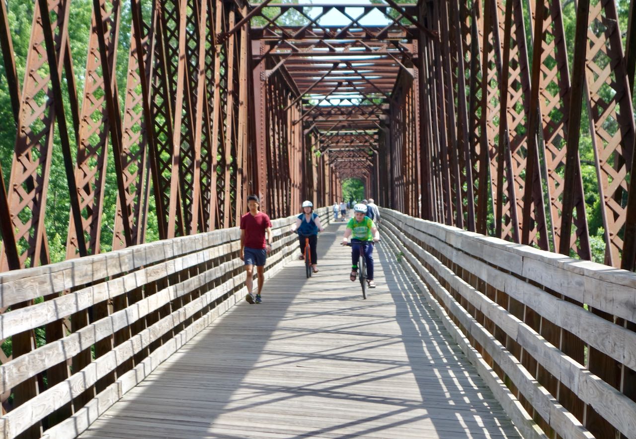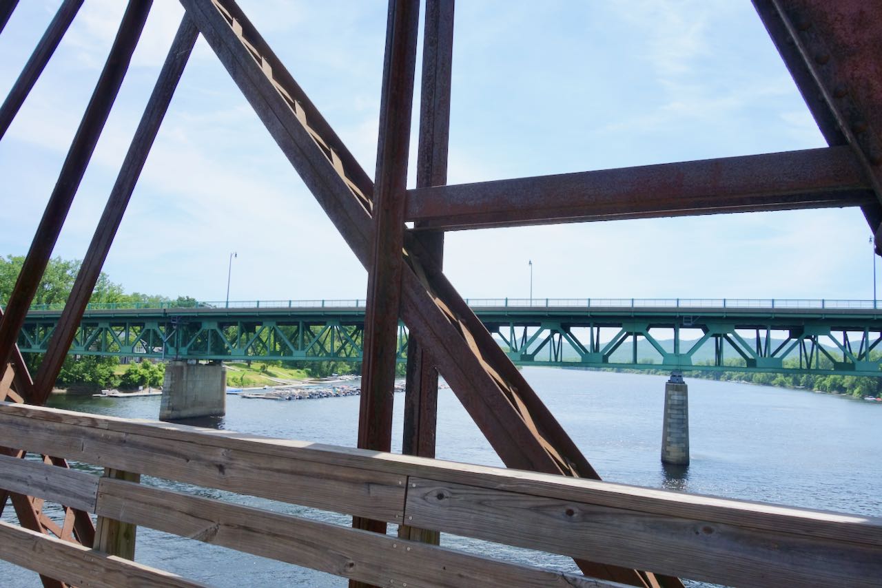 It is only eight miles by a lovely bike path from Northampton MA to Amherst MA. The trail crosses the Connecticut River on a former rail bridge.