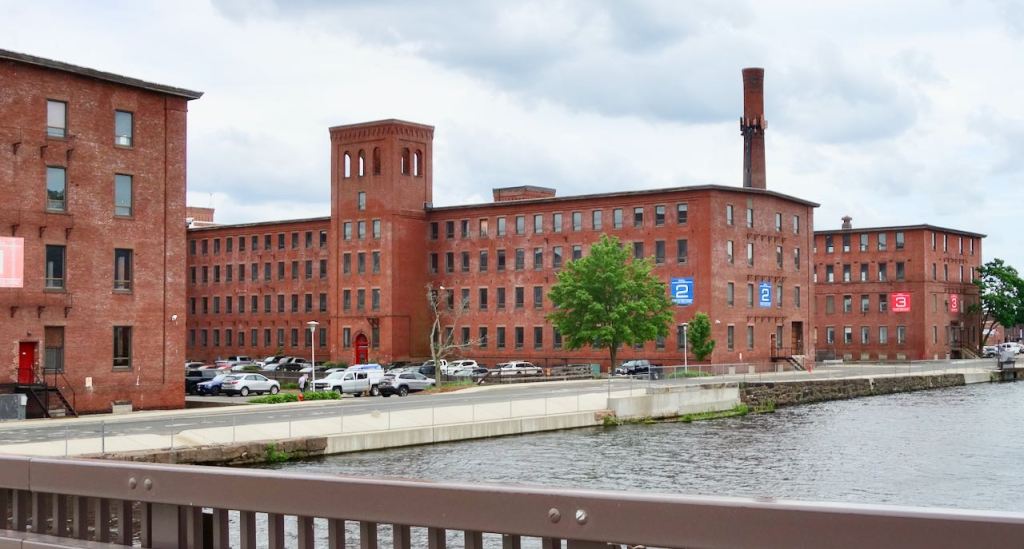Holyoke (population 38,000; about the same population as the year 1890) is a faded factory town seemingly full of poor people. I looks like another world from Northampton MA only eleven miles away. I have learned that in about 1890 Holyoke was the largest producer of paper stationary in the world. Huge brick factory buildings stretch along the canal that empties into the Connecticut River. Some of these brick mill buildings are repurposed, some not.