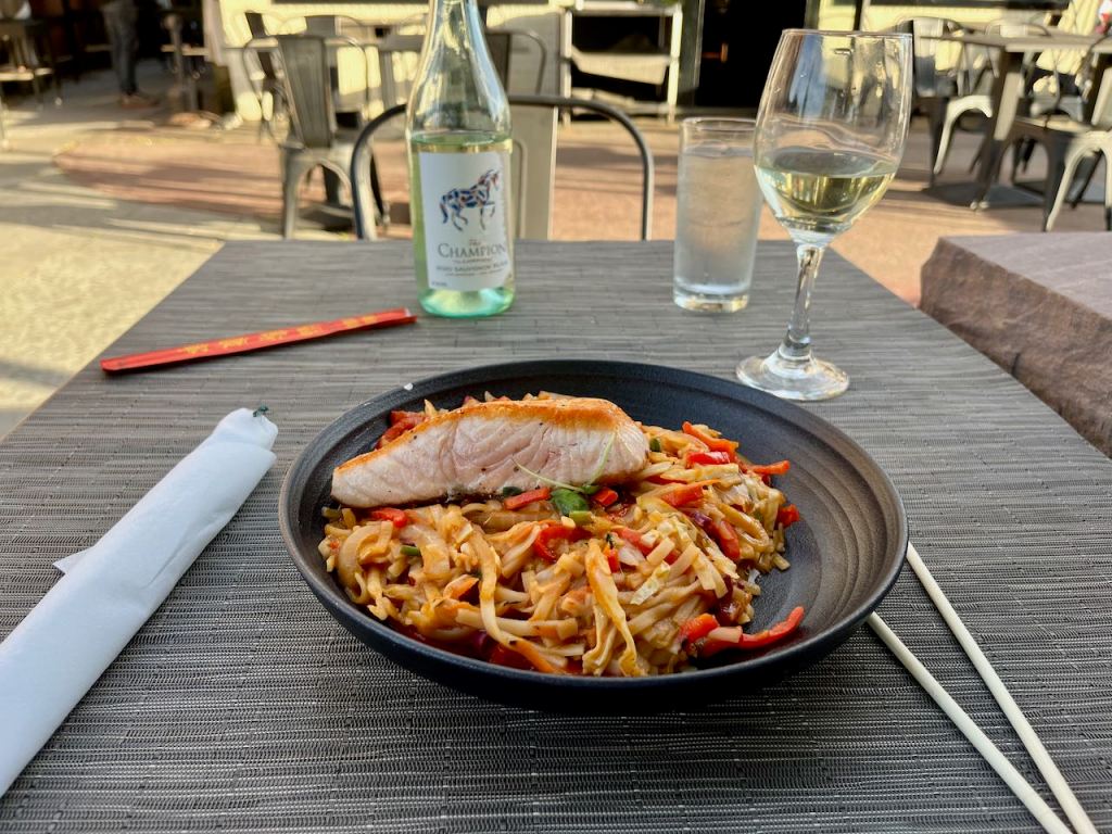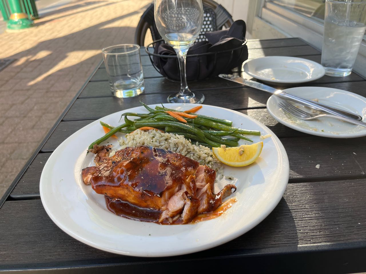 Still being COVID paranoid, I wanted to sit outside and had to wait for an outdoor table at the crowded Anthony Jack’s Wood Fired Grill in downtown Southington. Their special of barbecue salmon was quite good, so good that I came back to this restaurant four days later on my return. On both occasions it seemed like there were a lot of policemen and firefighters eating here.