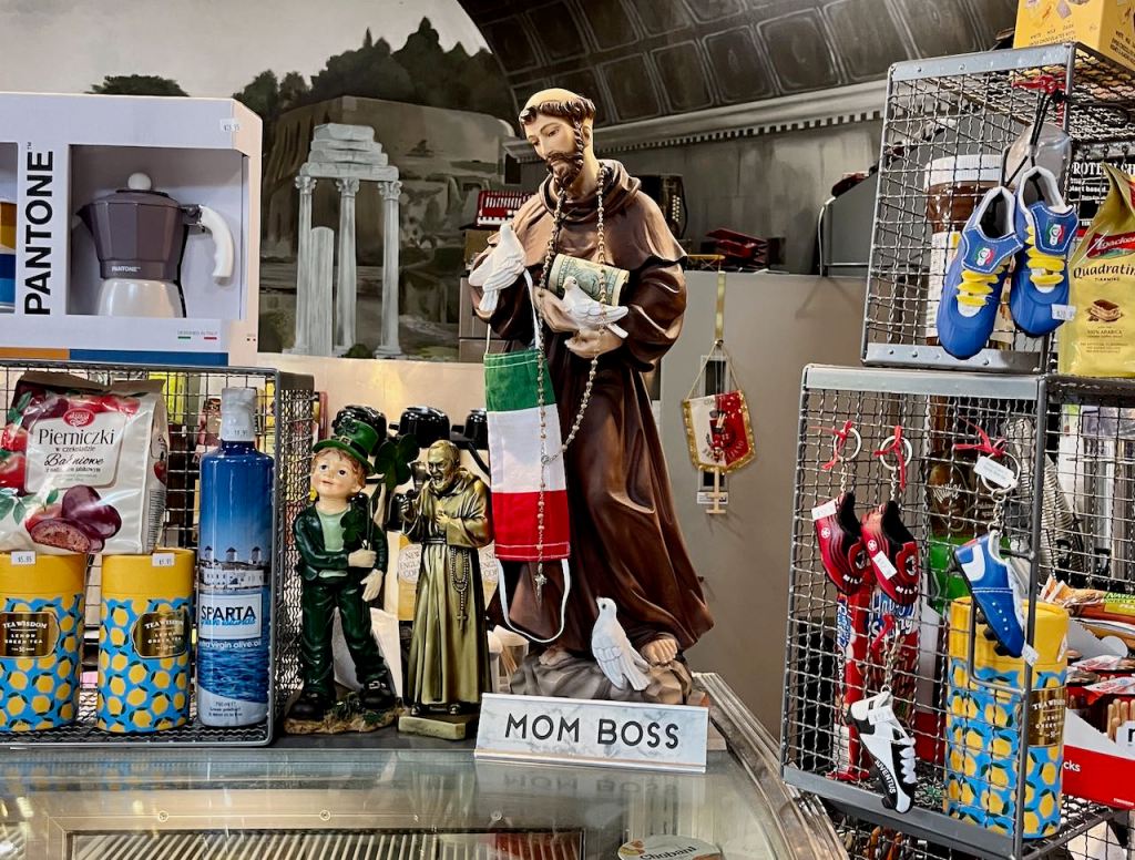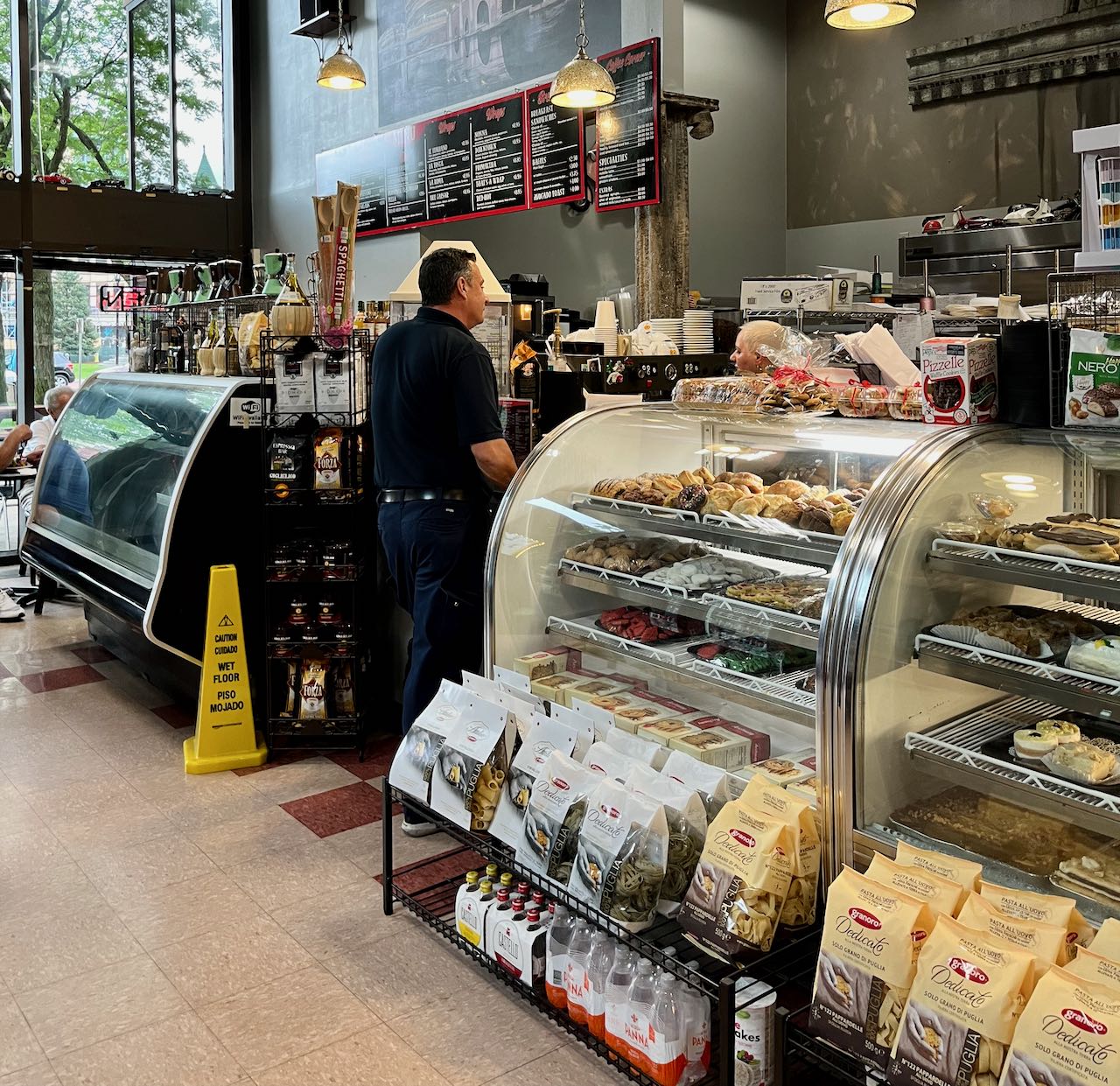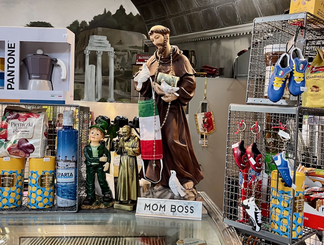 Breakfast in Springfield MA was the opposite of a machine-made hotel breakfast because I went to a coffee house a few doors down from the hotel, in the glassed-in ground floor of an office building. The ham and egg on bagel was delicious and custom made from a kitchen surrounded by Italian-American kitsch. The one indoor table was full of six older Italian-American looking guys. I ate outside.