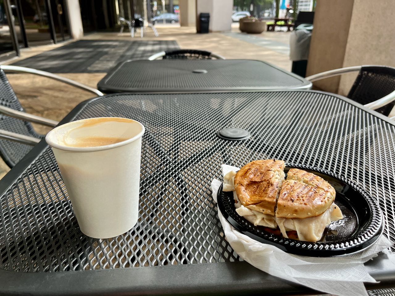 I got an oat mile latte, one pack sugar, plus a croissant. The croissant was not fresh but I enjoyed the outdoor seating.