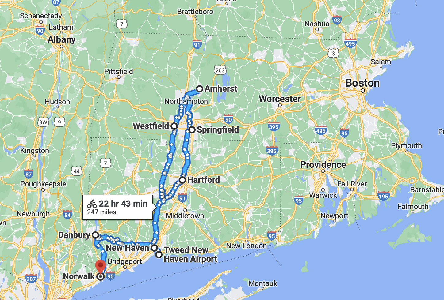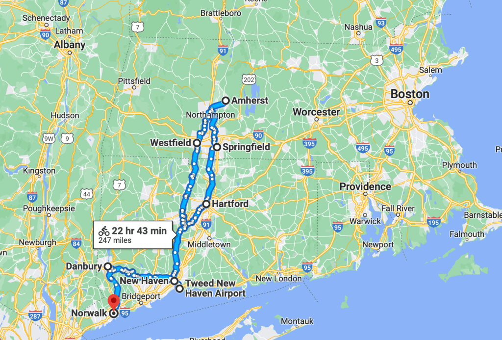 My idea for the next day was to bicycle a loop heading north through the Massachusetts college towns of Holyoke, Hadley, Northampton, and Amherst before turning back south and staying in downtown Springfield MA.