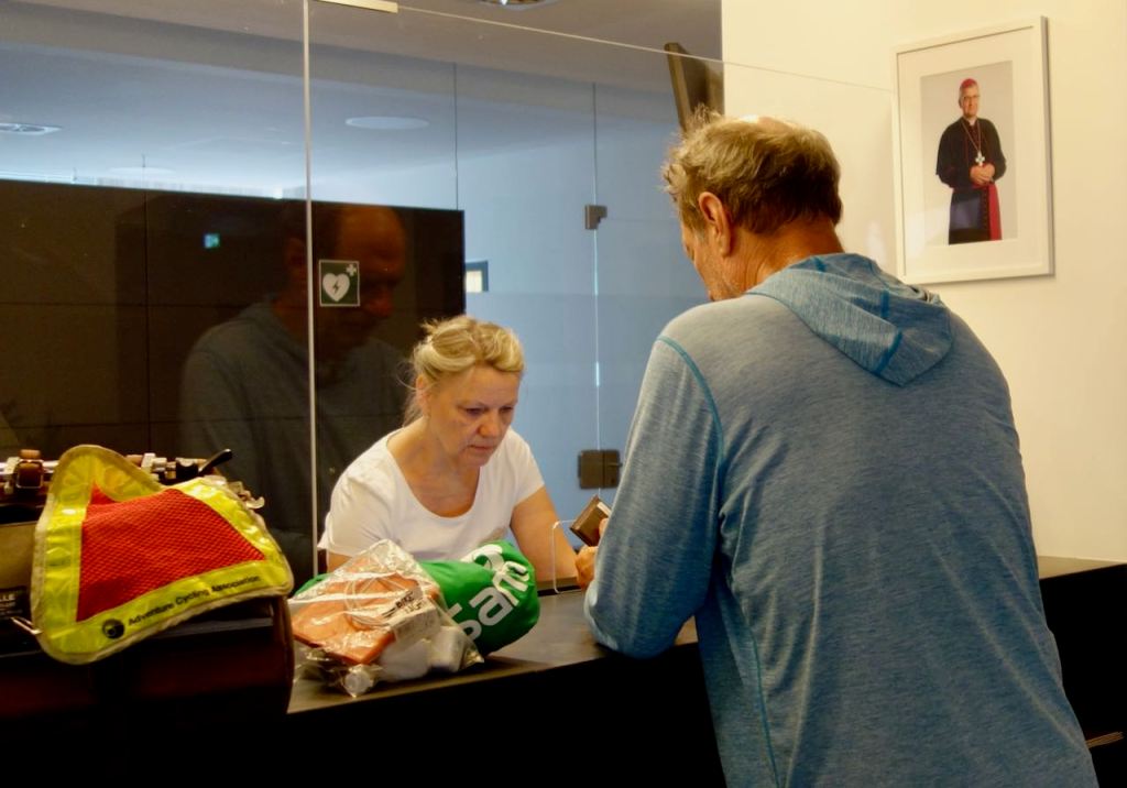 Maybe I should have booked a hotel in advance. Downtown rooms in Mainz seemed scarce. Google Maps referred to something called Erbacher Hof, which turned out to be a hotel owned by the Catholic church. We stopped by and asked if they had rooms. They did, sixty-something Euro each per night for single rooms, including breakfast, a very good deal. (Note: during this trip the Euro and the Dollar were essentially equal.). Some Catholic guy on the wall seemed to watch as Lyman checked in.