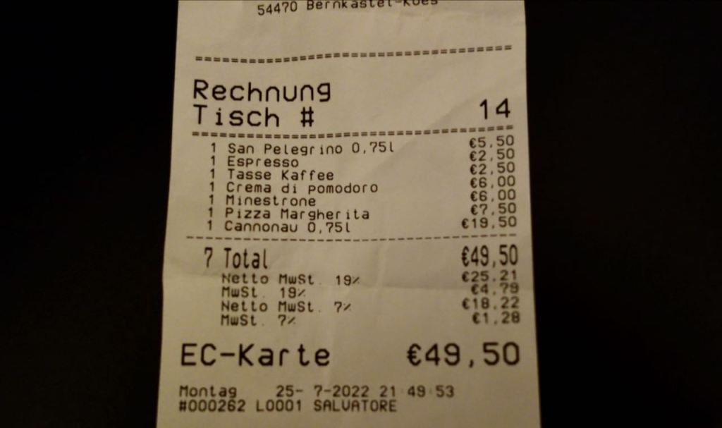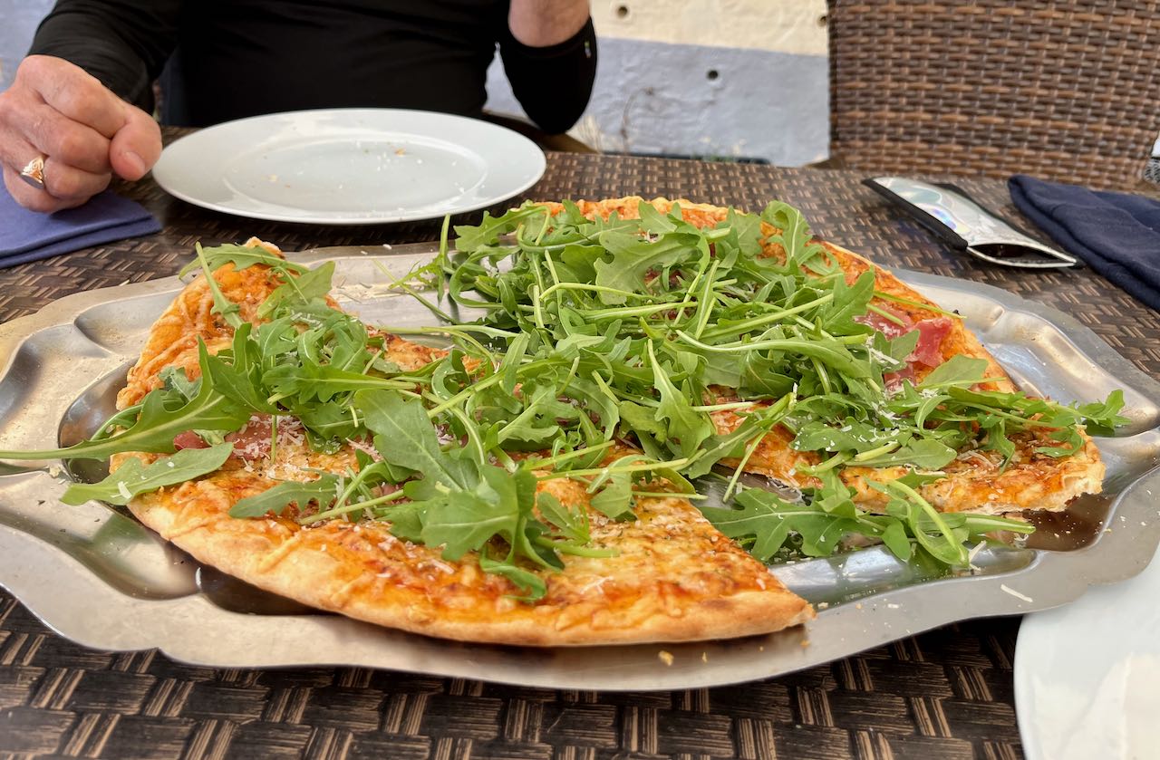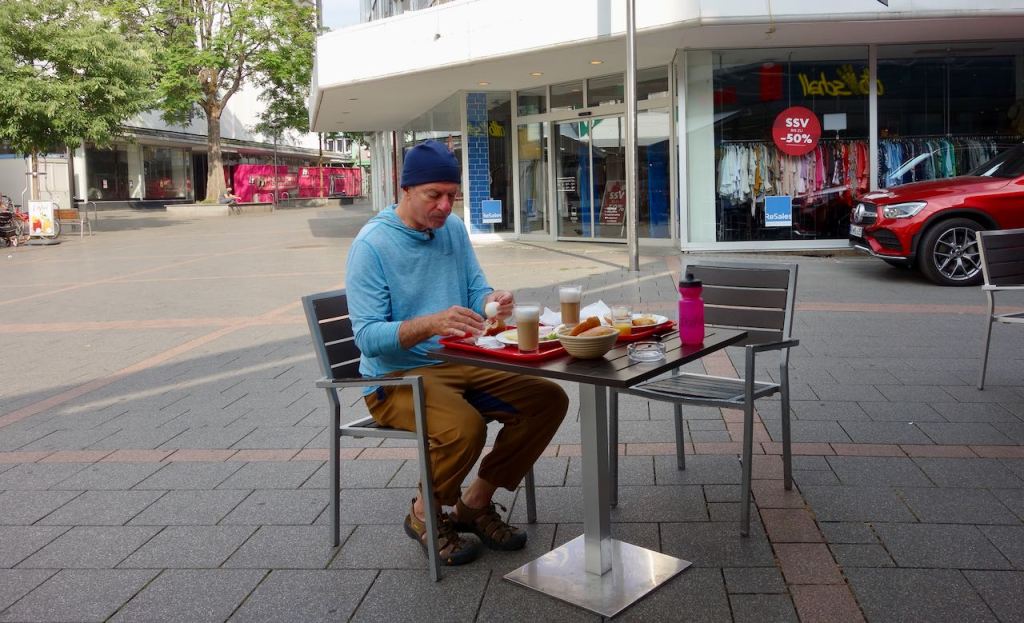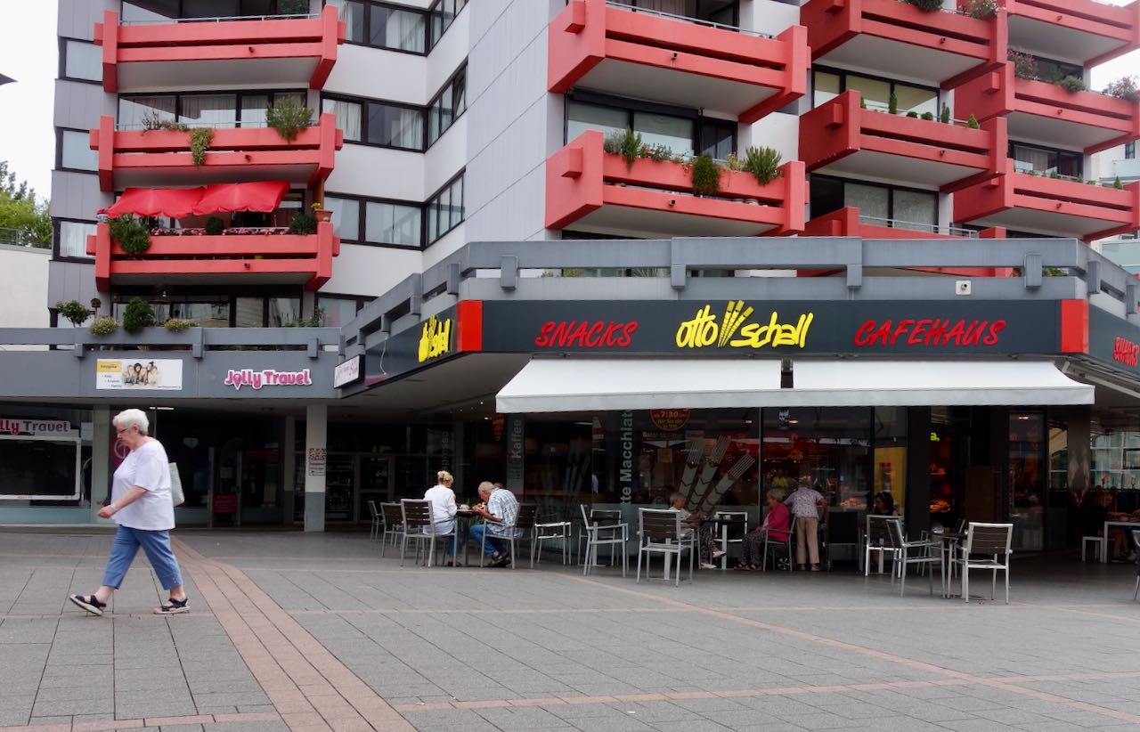 Around the corner we found low cost hotel rooms at a place owned by and next to a South Asian restaurant. We wanted to eat there but they had only indoor seating. No place looked to be serving German food. The busiest restaurant was Italian. This being Germany, we were worried that they were about to close, as many restaurants in Germany stop taking orders at 8:00 PM. We finally got a table indoors but next to an open window. We each got a soup (cream of tomato and Minestrone) and then split a pizza. With a bottle of wine and coffees, it was only EUR 49.50 for two and delicious; a meal we enjoyed lingering over. Eating out here is definitely lower cost than the USA, even after having been hustled to buy a bottle of overpriced Italian water.