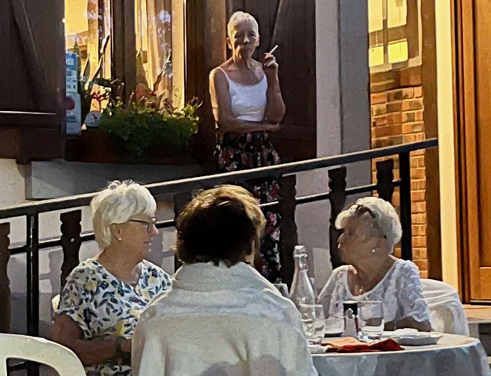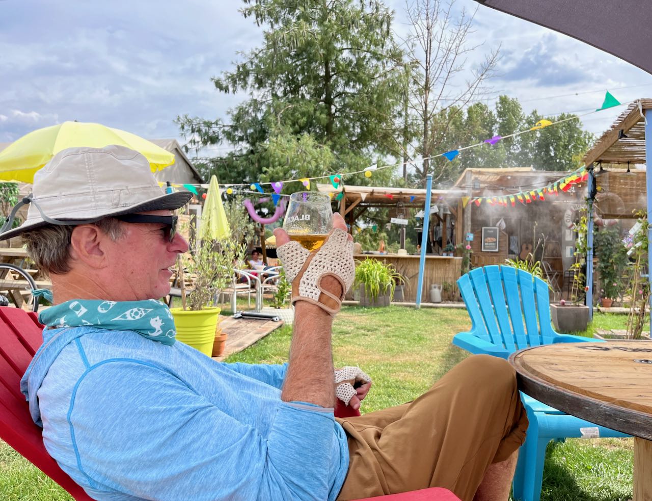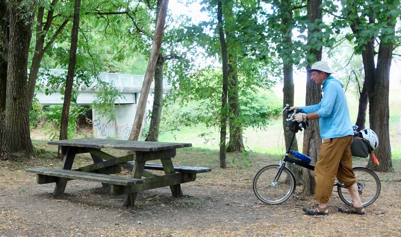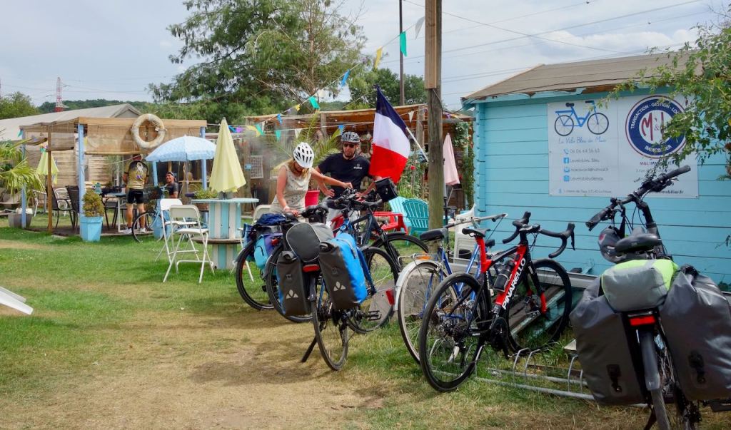 Back on the bikes, even closer to central Metz, where the bike trail meandered through an agricultural flood plain, we stumbled upon a fascinating outdoor venue, super low tech (the place barely had a bathroom) but with a nice vibe. We had to stop and drink a beer. Most patrons looked to have arrived by bicycle. There were plastic chairs and umbrellas. The guys who were likely the proprietors were two nattily dressed older men in Lacoste shirts.