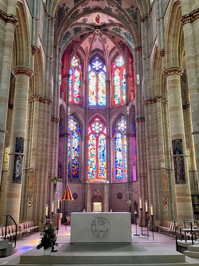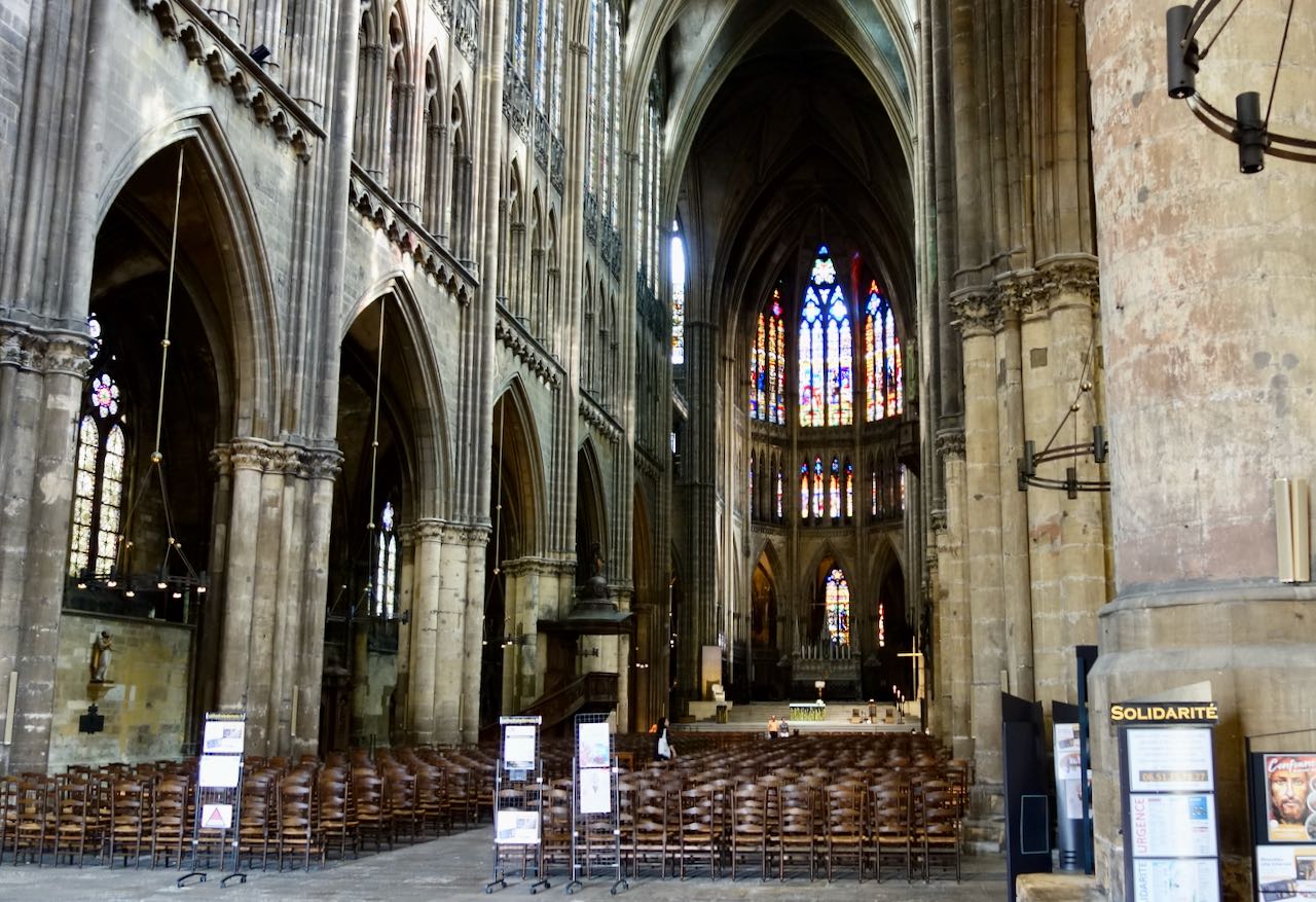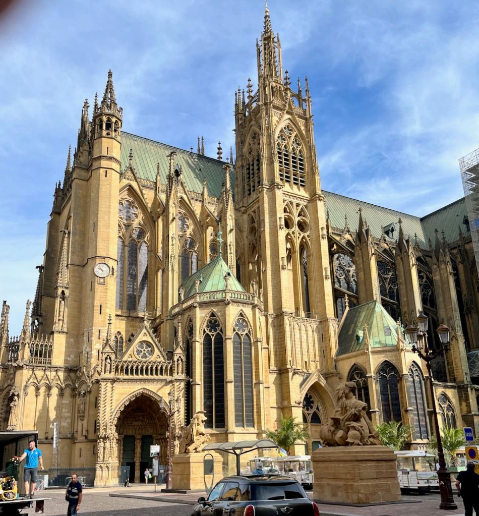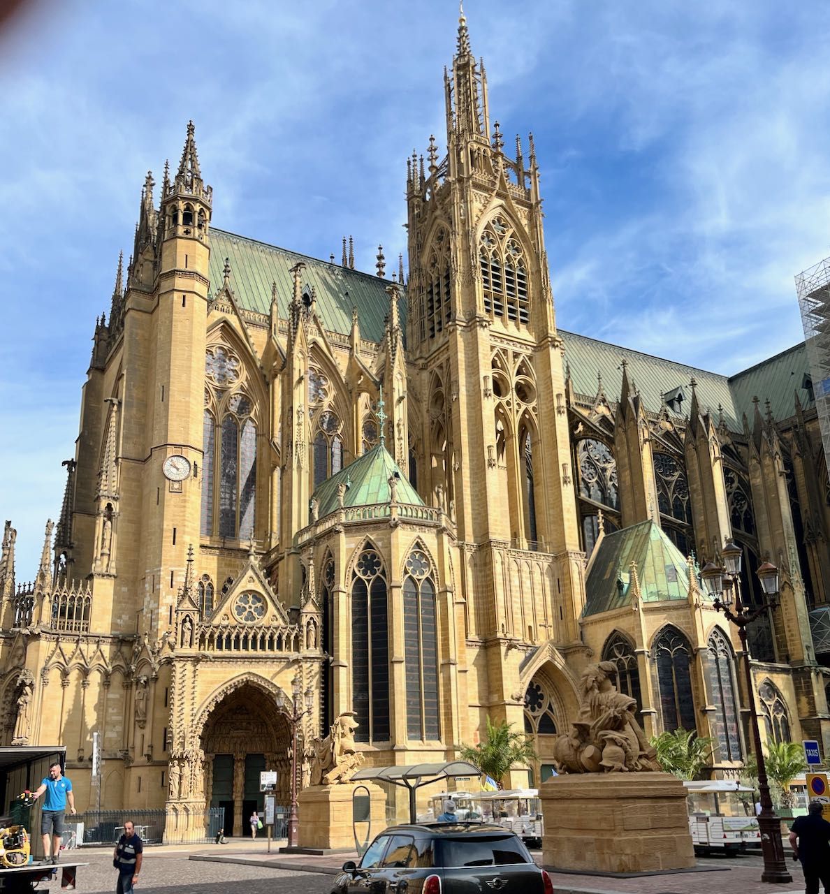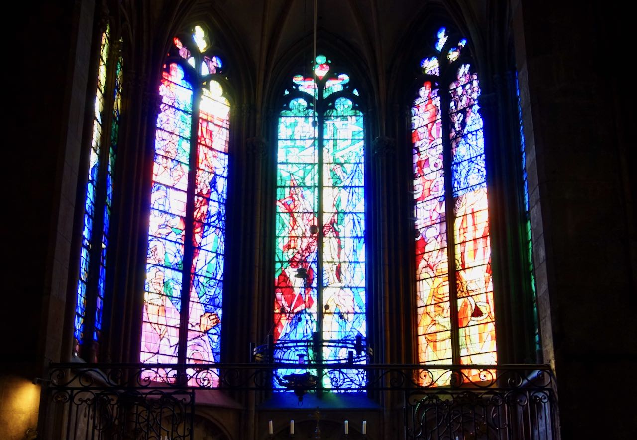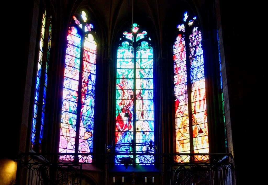 The Metz cathedral is stunning. It has extensive stained glass windows made in various styles over seven hundred years, including twentieth century stylings from artists like Marc Chagall, with cubist and abstract windows complimenting the older styles.
