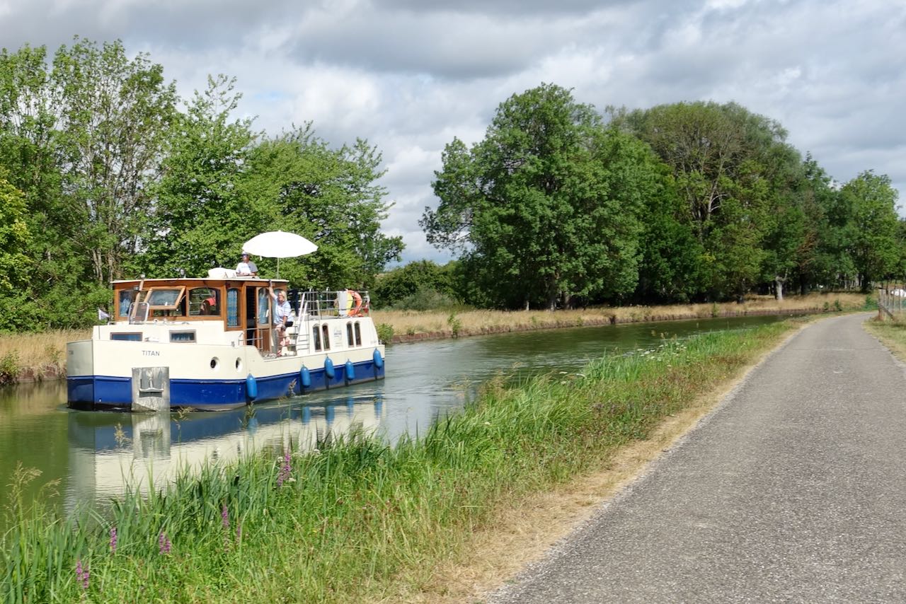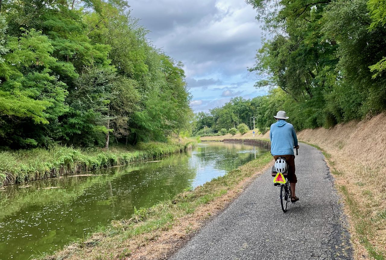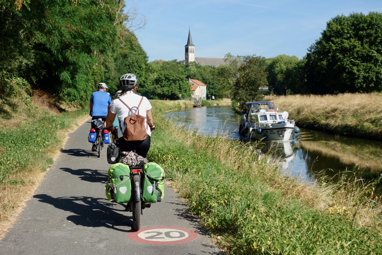 All was not perfect. We were in France not Germany. In a swampy region it was not clear which bicycle route was the best. We followed a fine gravel path along a canal until it degenerated into a rough gravel path, then, at a lock on the canal, a fence and a sign stating (in French) to go no further. What to do? A hiker about our age walked up. He sign-languaged us that everybody just walked around this fence. We waited for him to go first, then pushed our bicycles through a tiny opening in the fence.