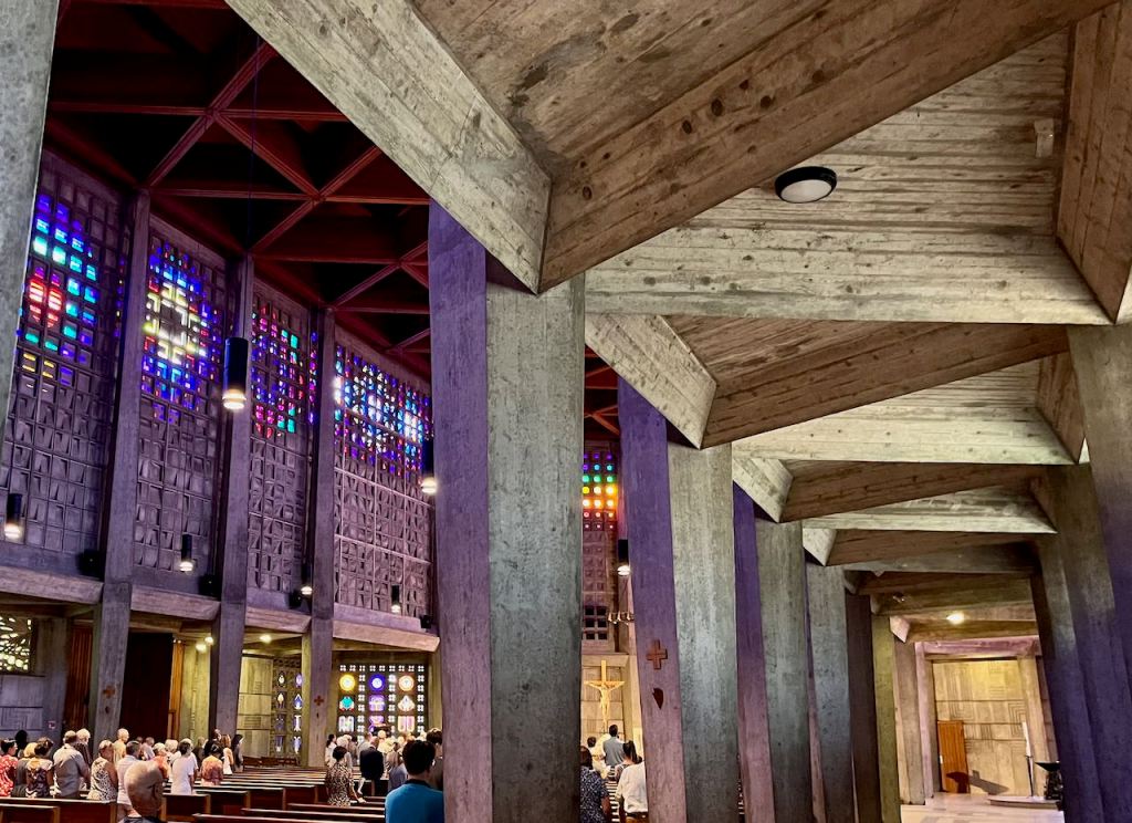 It turned out to be a modernist Catholic Church built in 1954, to replace one destroyed in the War. On our way out of town Lyman quietly ignored the fact that a service was going on and snuck inside to take pictures.