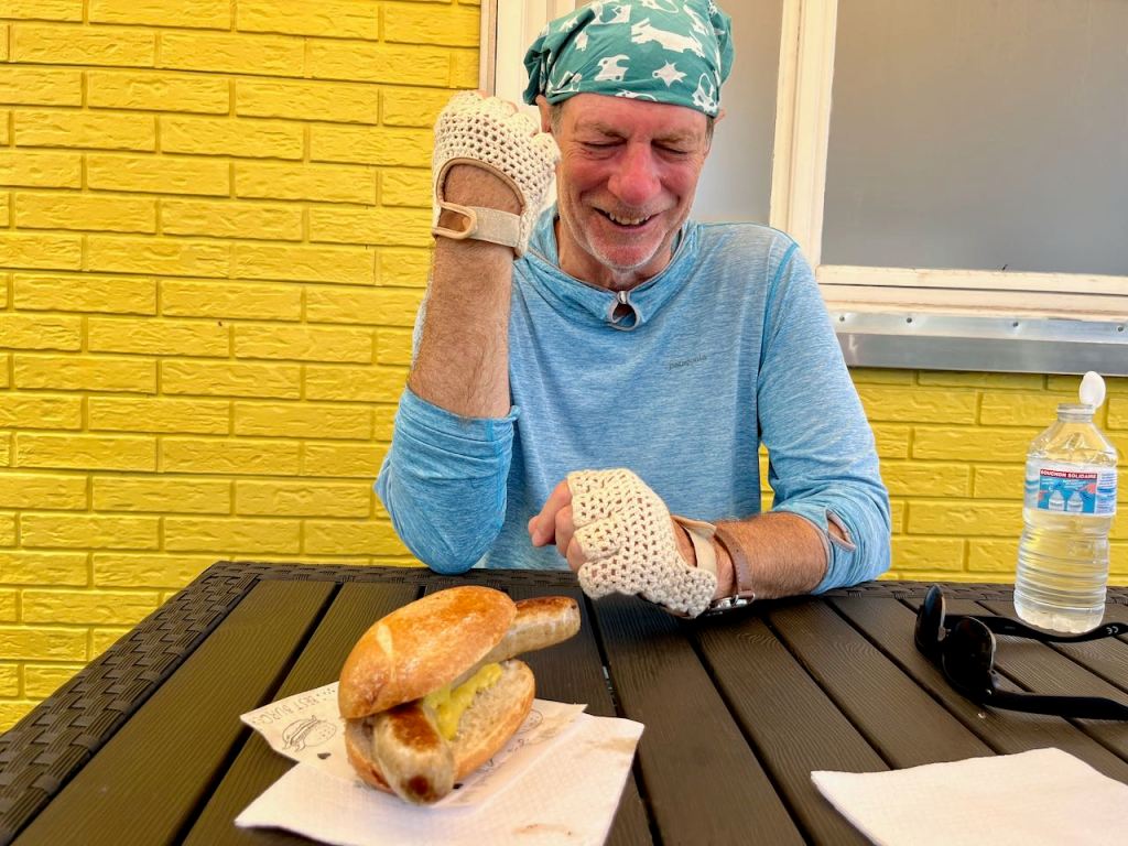 Farther on we found a gas station that did have ice cream bars. I struggled to find a piece of shade. The only place to sit was the curb.