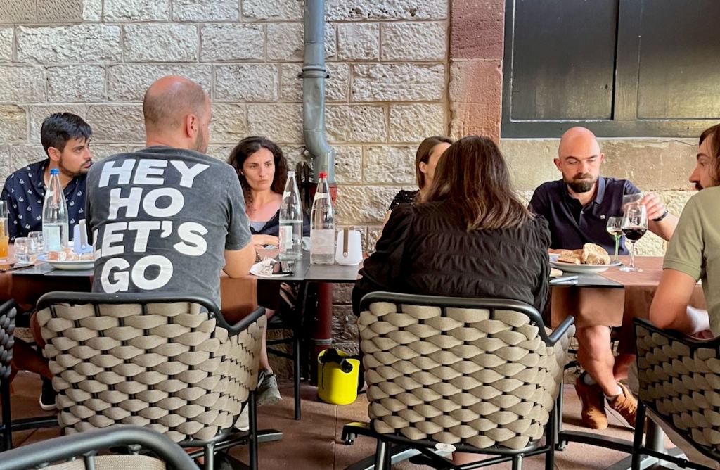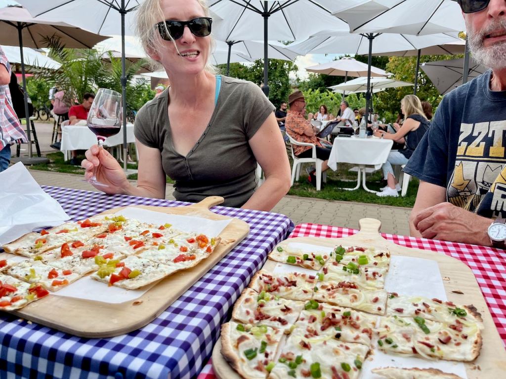 On the drive to their house they stopped at a wine store they knew, in a small town, and found out it was having a Saturday afternoon outdoor five Euro unlimited wine tasting. Tom says the Germans are always having “events.” We all had a good time. In addition to all the wine they eventually ordered two flammkuchen, which I learned is NOT pizza, it is a German dish, a local flatbread with cheese or other toppings.