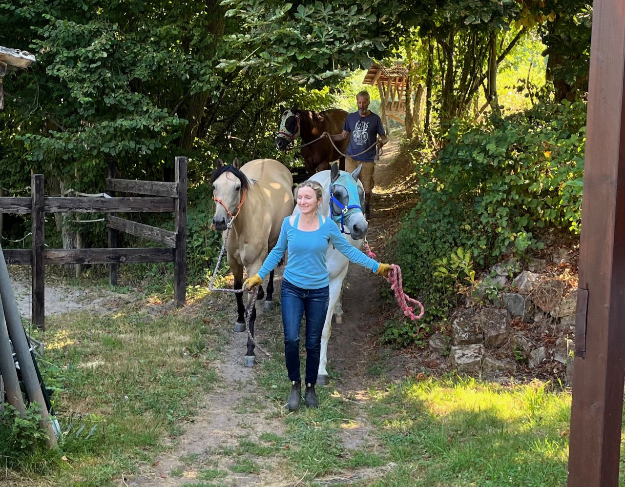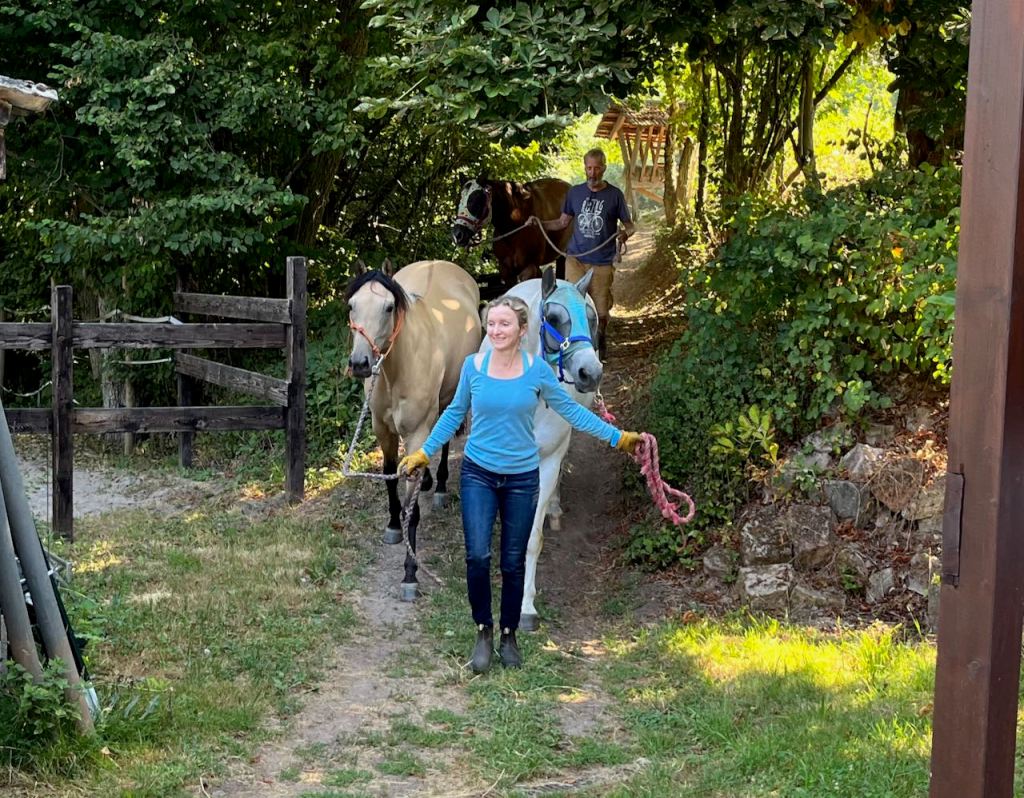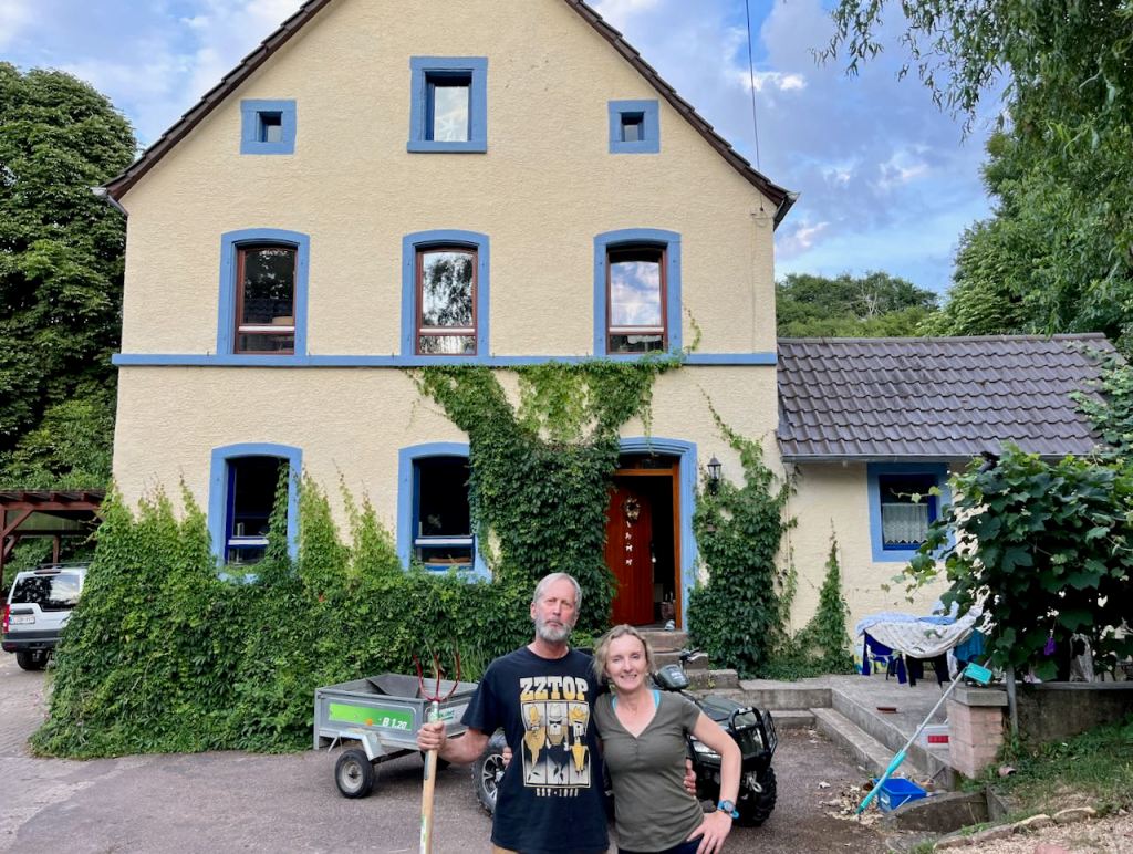 Tom and Jana’s home is an impressive abode; a former water mill surrounded by pastures where they can keep their three horses. They posed as American Gothic in front of the house.