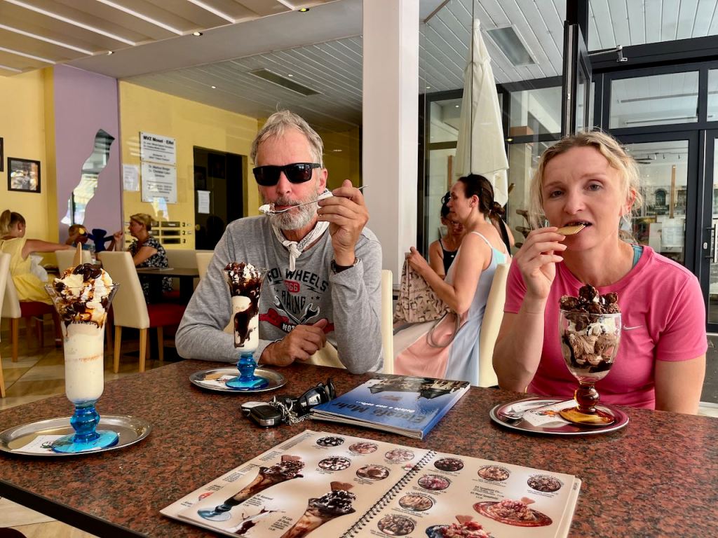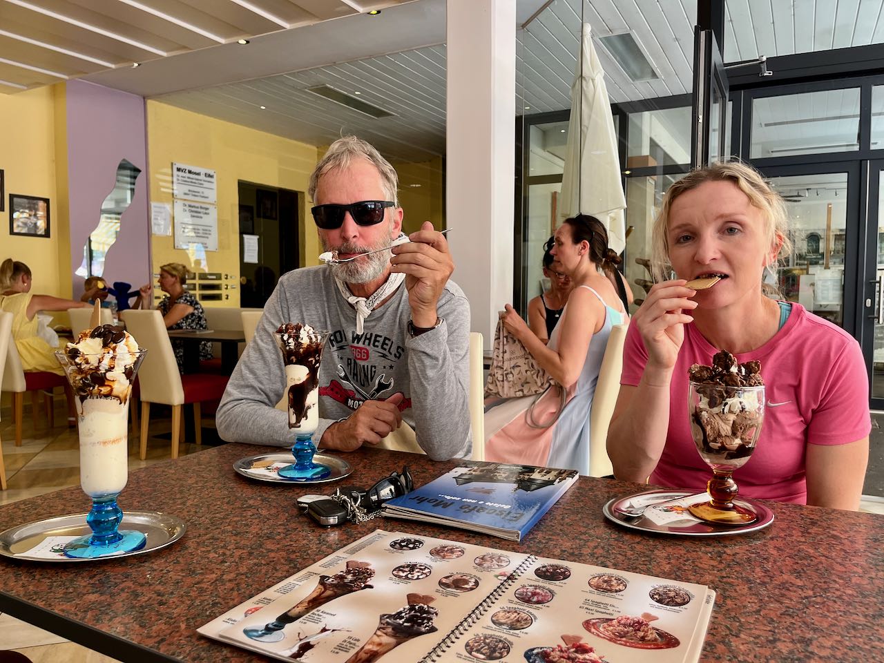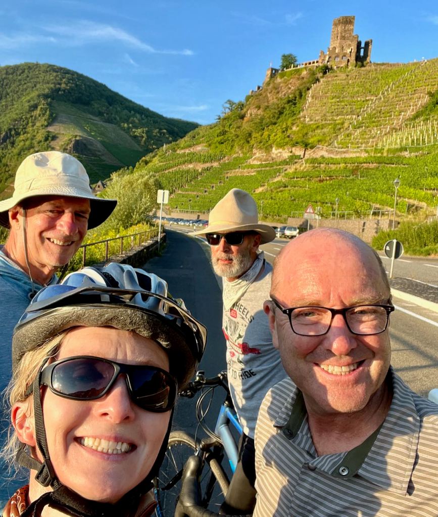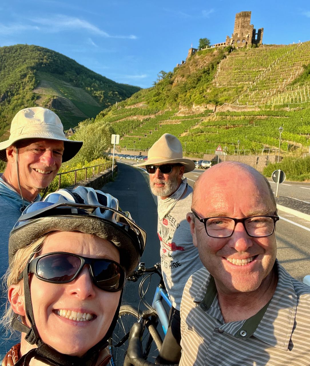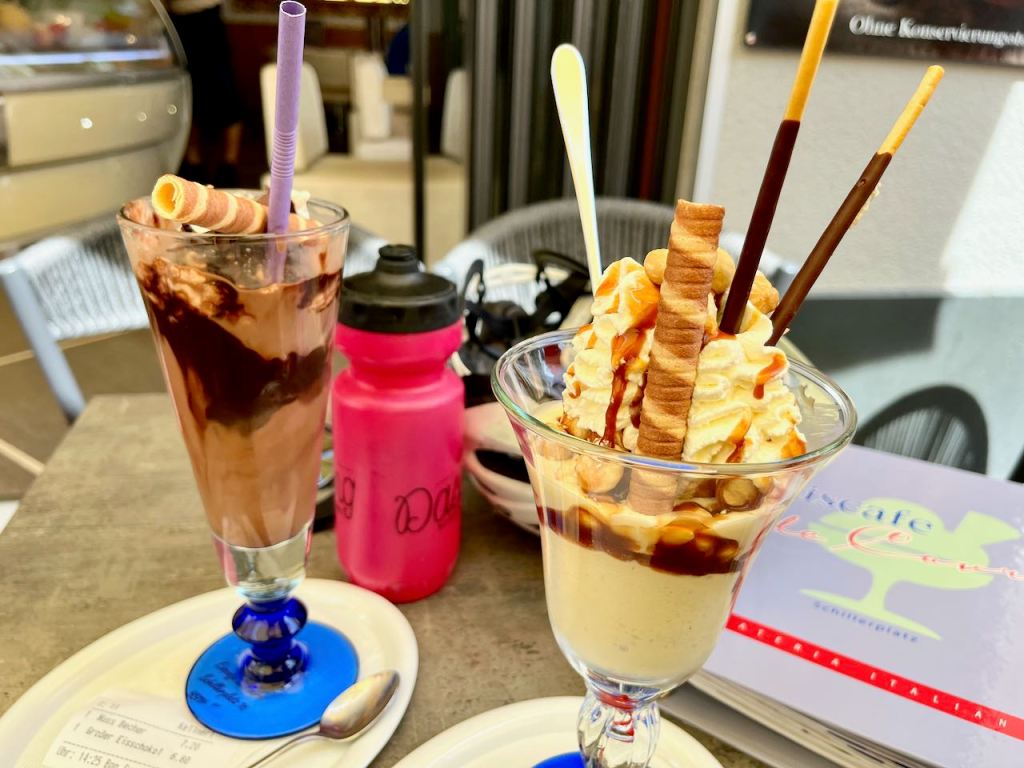 The next morning we had a peaceful breakfast on Tom and Jana’s patio. Afterwards, Tom and Jana drove the four of us and our four bicycles about a hundred kilometers further west to the town of Traben-Trarbach, on the Moselle River. They had cycled in this area before and spoke highly of the route. We parked the cars and prepared to cycle. First we had to go out for ice cream. Germans like a big selection of fancy ice cream concoctions.