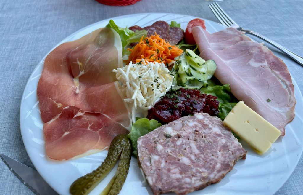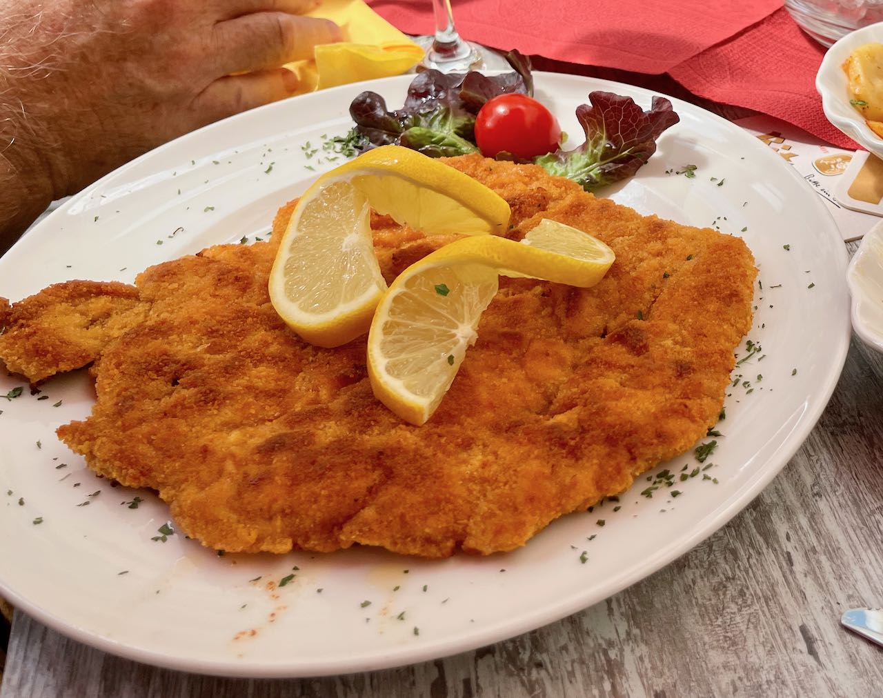 Tom and Jana could only be out for one night because they had to take care of their animals back home, and we went with them back toward their cars. We started cycling back south, then took a train for much of the way. At a riverside town we had a nice German lunch of schnitzel. A salad was included as first course.