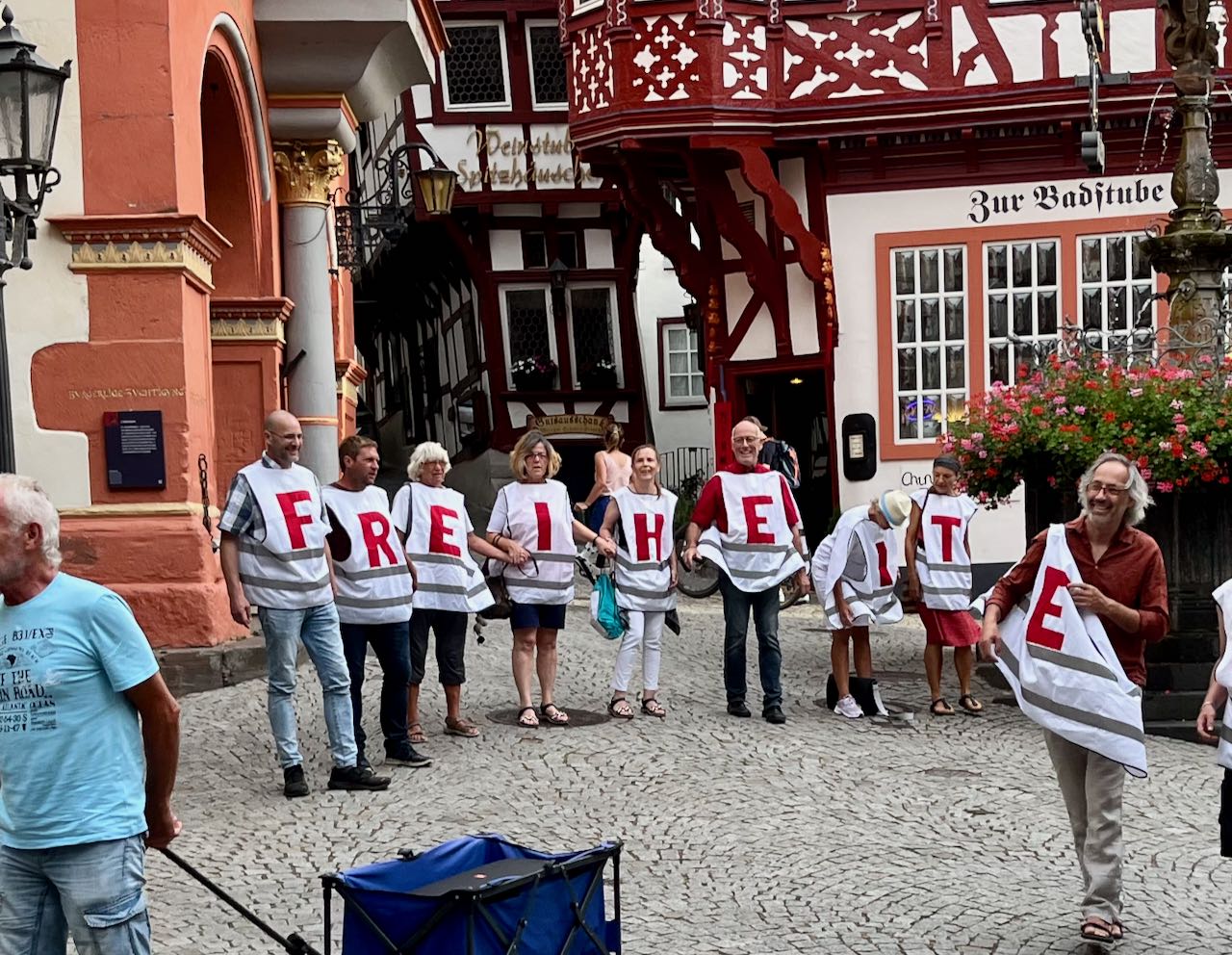 While pondering what to do next, singing sounds came from one block away but we could not see what the singing was about. I walked over to look. (I love public unison singing.) There was a group people with letters that spell out FREIHEIT which I learned (because of Google on my phone) spells FREEDOM. (there were other words being spelled as well, I missed those!) I took it as some kind of right-wing demonstration but I am not sure. Everyone seemed happy and peaceful. I still kick myself for not asking someone what it was about. I guess I will never know.