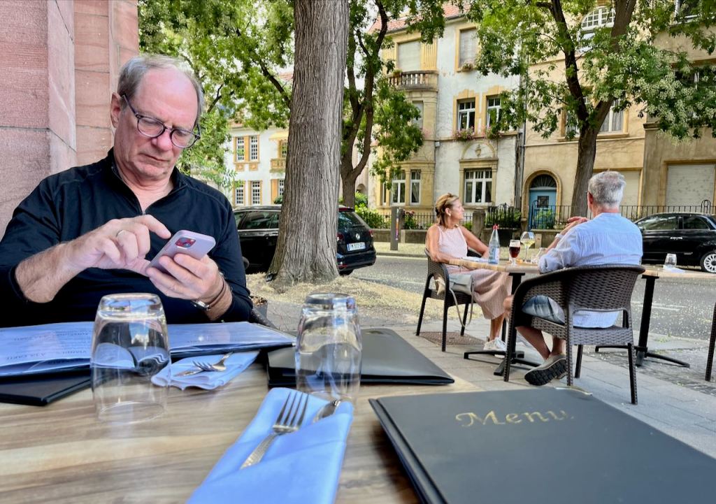 More than anywhere we had been on this trip, Metz felt like a real city, a special urban place. I looked on TripAdvisor for restaurants in Metz and called for a reservation that night at somewhere called Au Petit Louis. I tried to talk in French but failed. They passed the phone over to somebody who spoke English. Lyman and I walked almost a mile from our downtown hotel to a leafy mid-town neighborhood and took a table outside on the sidewalk.