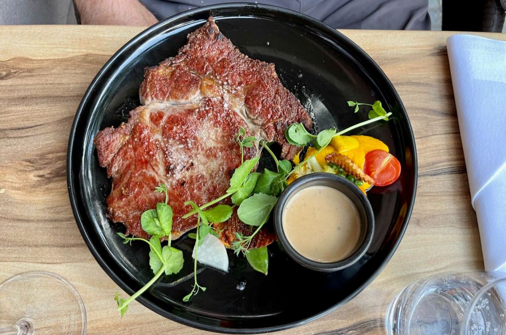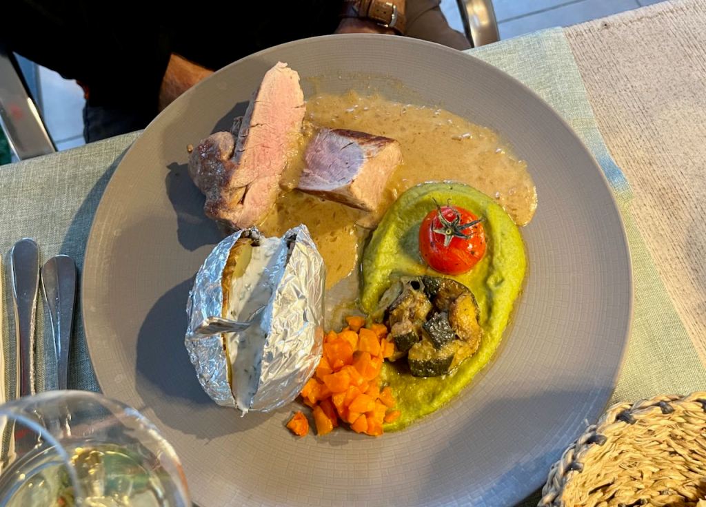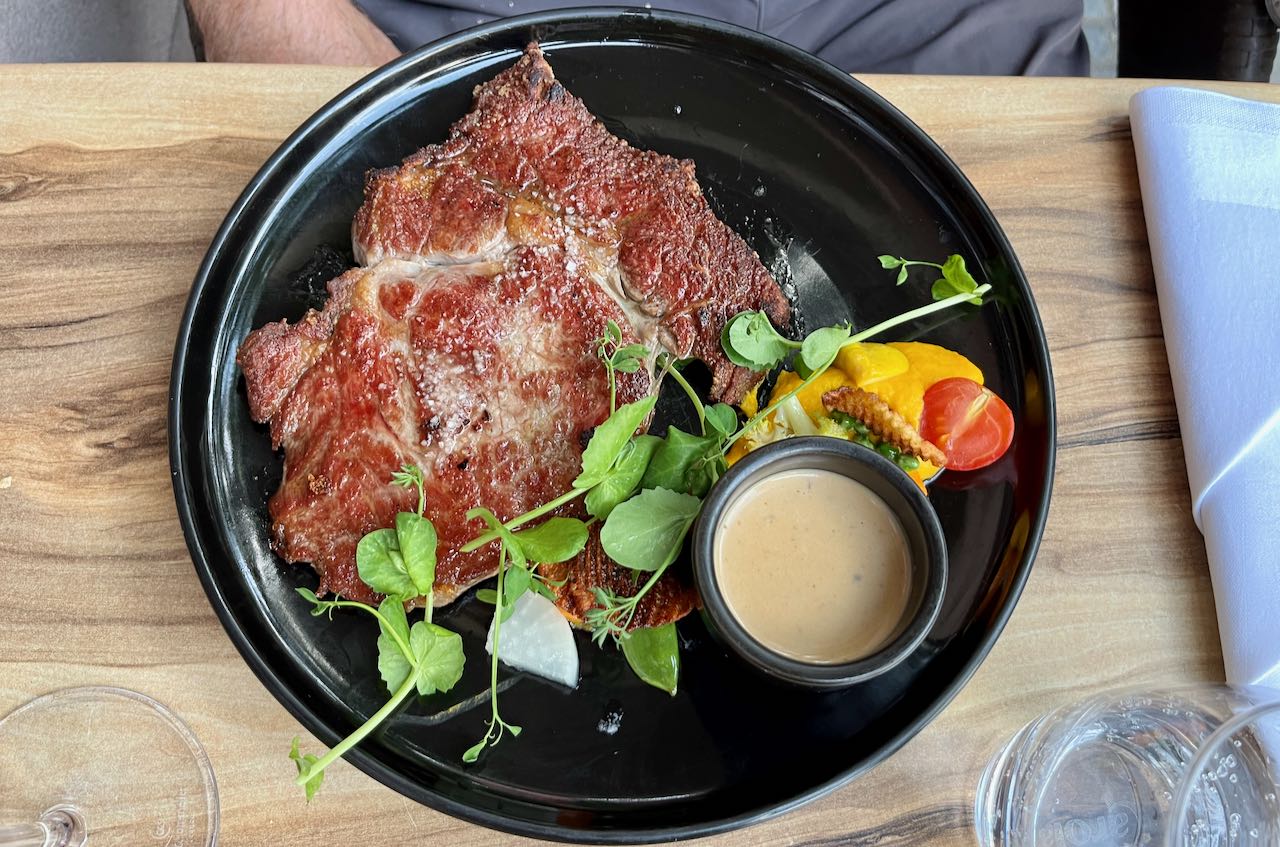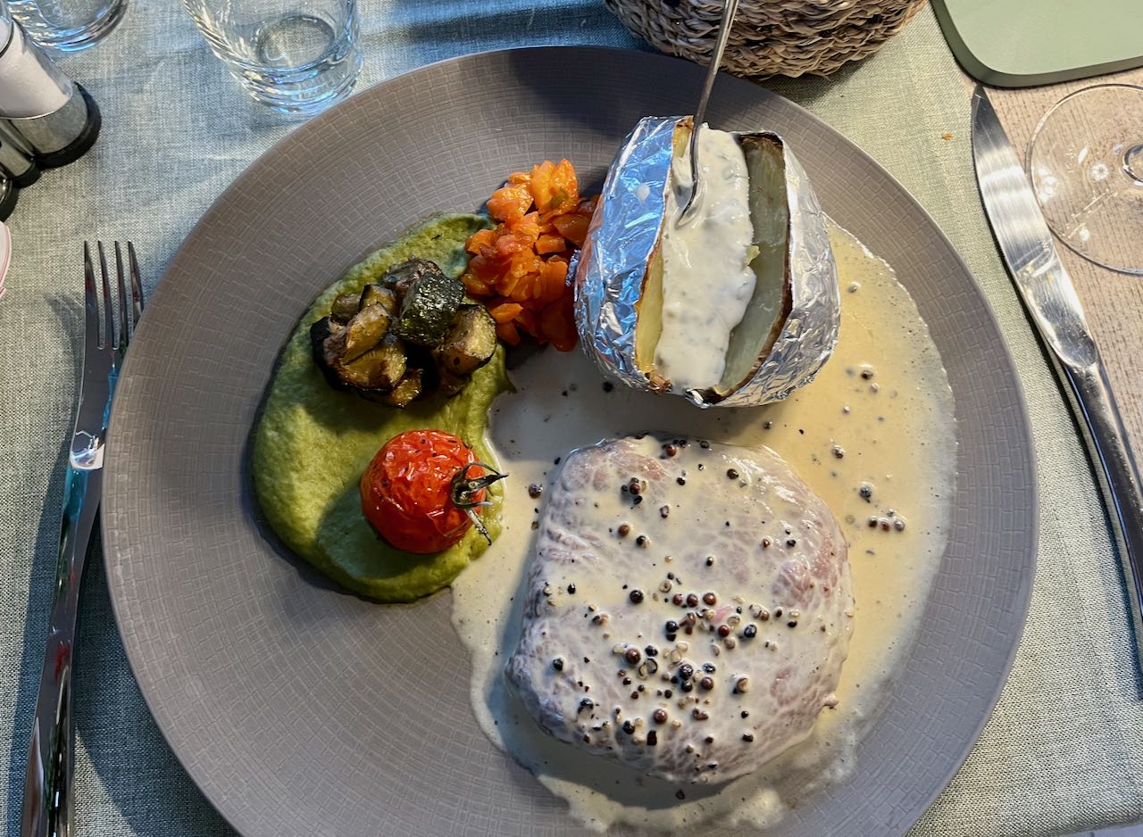 One of us got the French version of prime rib, the other steak au poivre. We sat out back outdoors on their terrace as did just about everybody else.