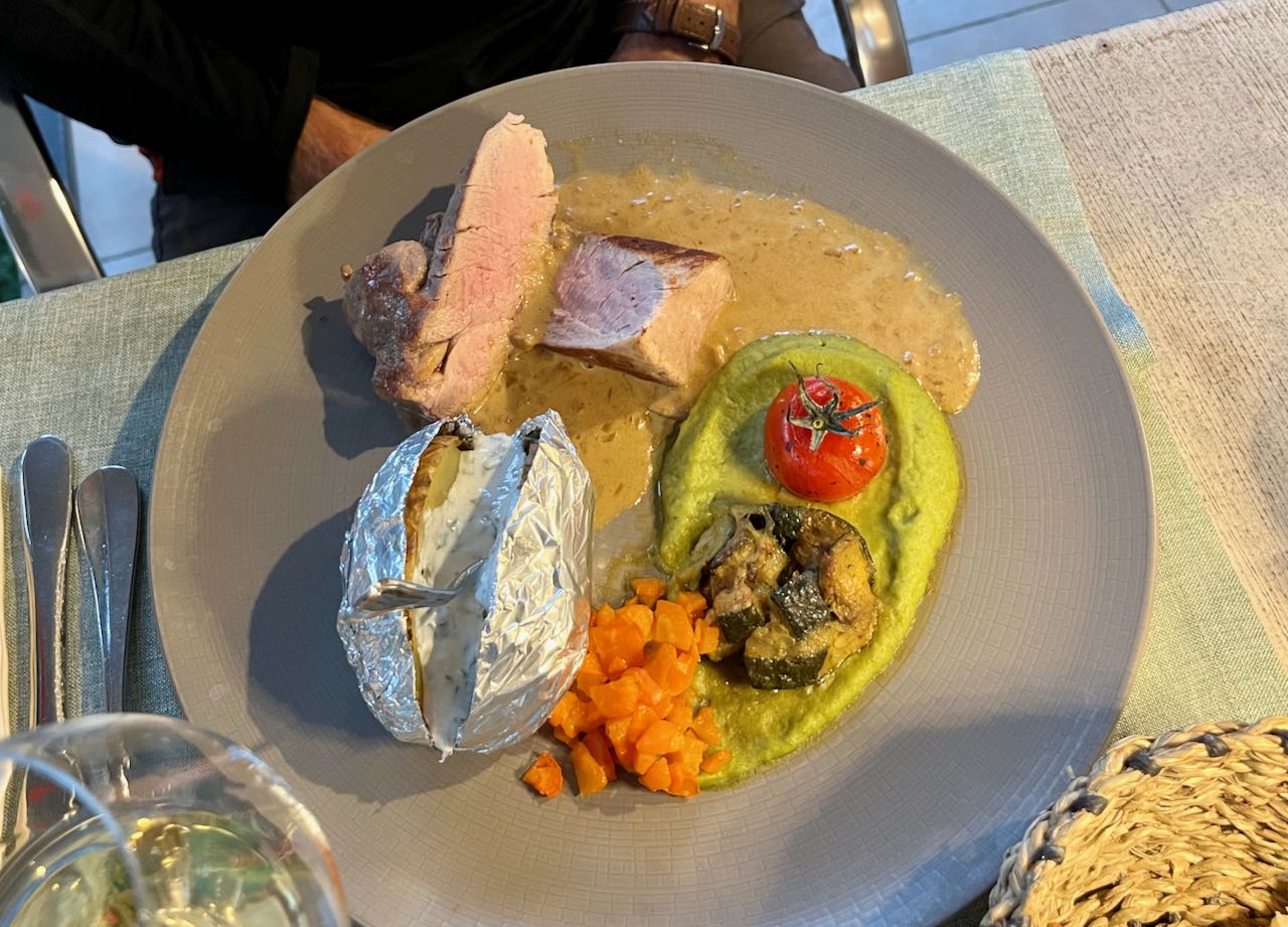 Dinner at a Greek restaurant was delightful. There was moussaka. During these still COVID times on this two week trip we ate essentially every restaurant meal outdoors. The weather was almost universally perfect for this.