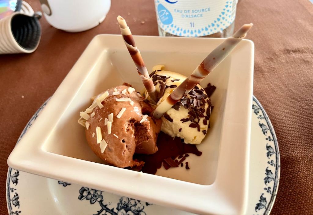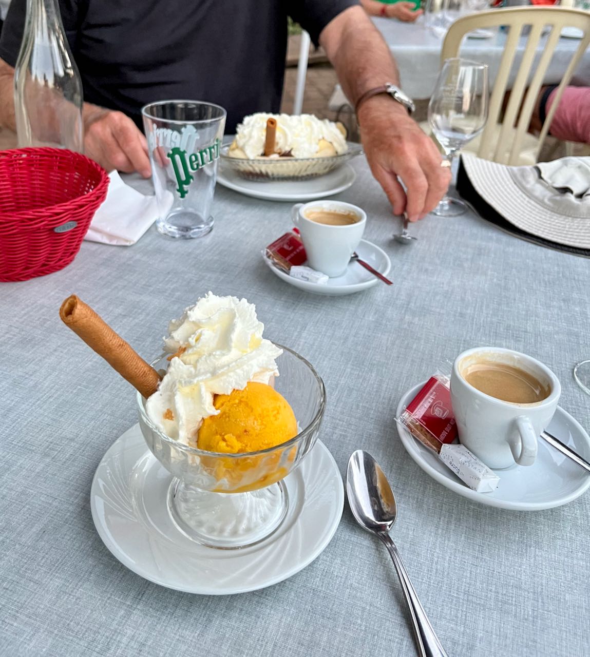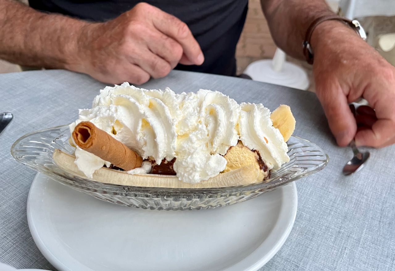 Coffee and dessert? Bien sur! Lyman got a banana split.