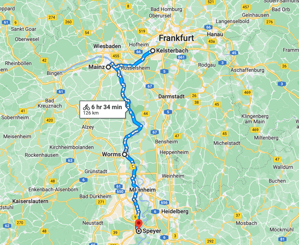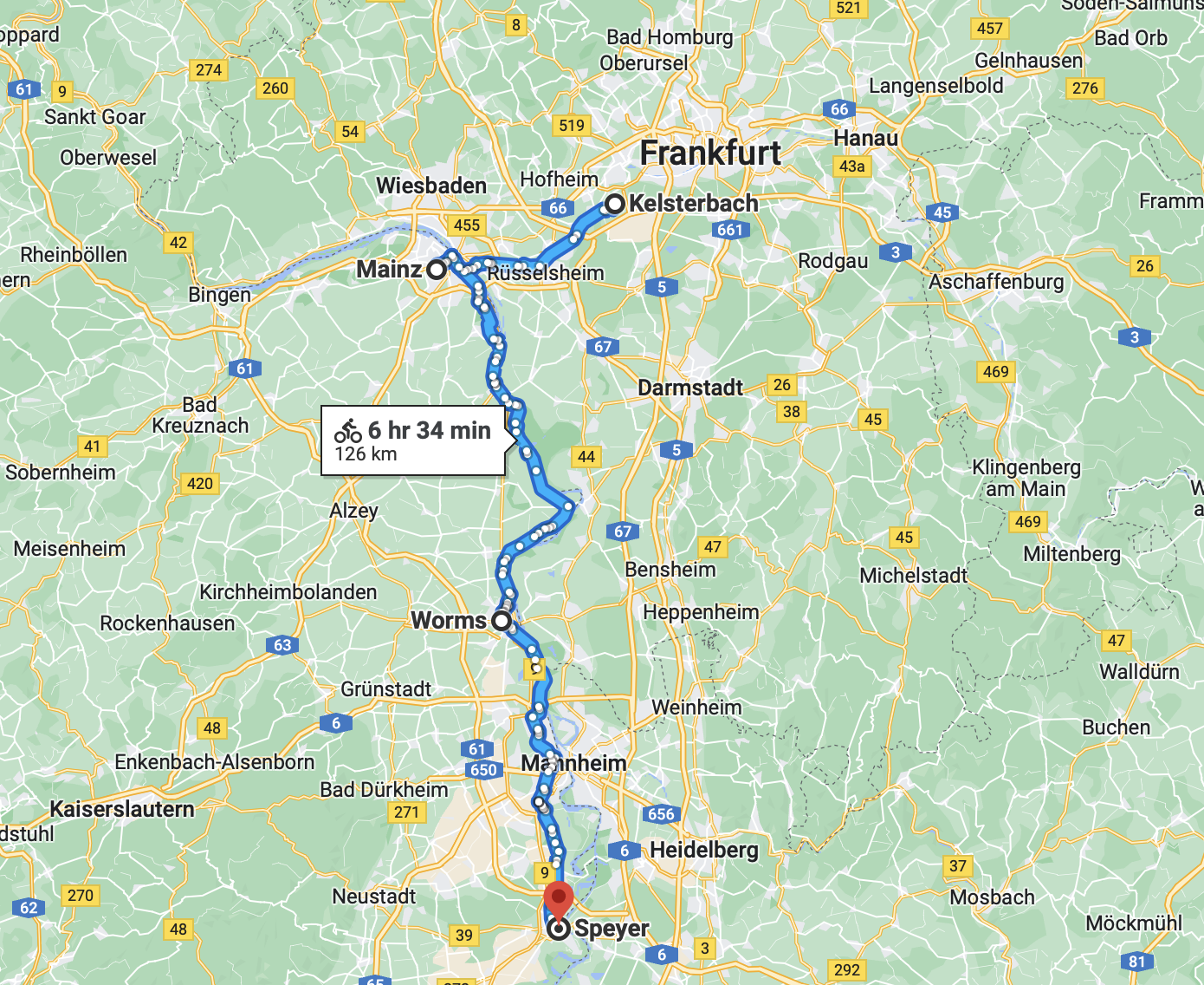 After a Middle Eastern lunch we commenced cycling in the early afternoon. It felt good to be outside and moving around, despite not really having slept much on an overnight flight. We were starting about fifteen kilometers from downtown Frankfurt but heading west, the opposite direction. There is a delightful bike path along the Main River. It would be an easy twenty-six kilometers to the city of Mainz. This is a map of the first three days of cycling, before Tom drove over and picked us up in his car.