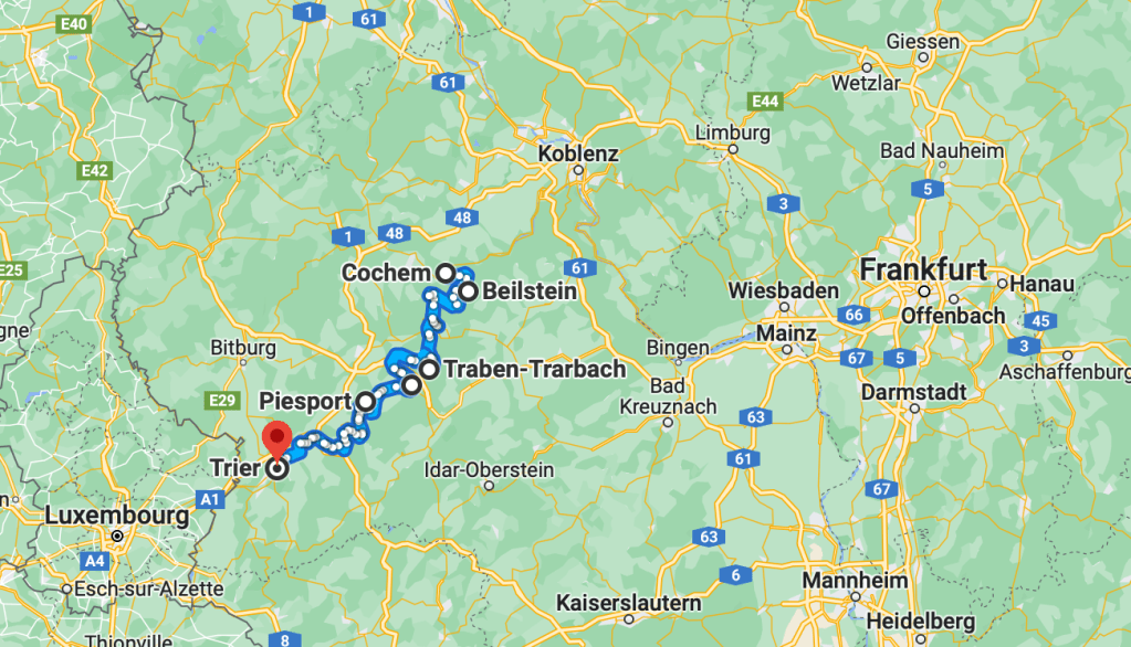 After lunch we cycled further south and arrived back at Tom and Jana’s cars. They loaded their bikes and headed home. It had been great to see them. Lyman and I continued south upriver by bicycle. This map shows our ride with Tom and Jana plus the next two days of cycling the Moselle, showing the route as the Moselle sharply winds through hilly countryside.