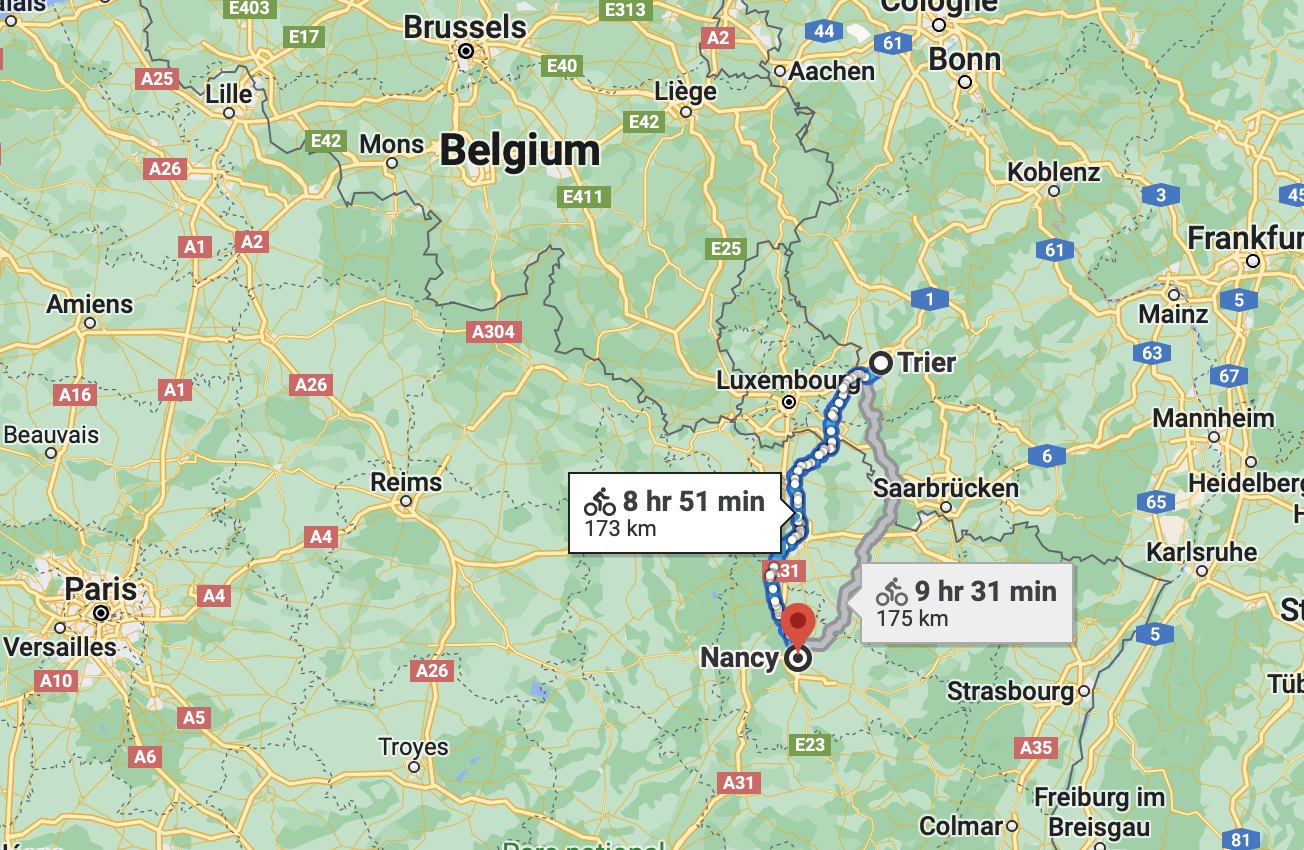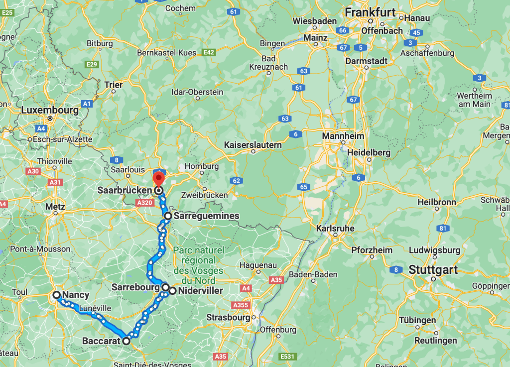 The next day we stopped cycling along the Moselle and found another route. We had four days left to cycle on our trip, and we chose to stay in France, We would cycle along the Meurthe River, heading southeast of Nancy to Baccarat, then loop back towards Germany. This is the route of the finals days of our trip from Nancy to Saarbrucken, which sits on the German/French border.