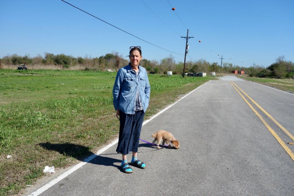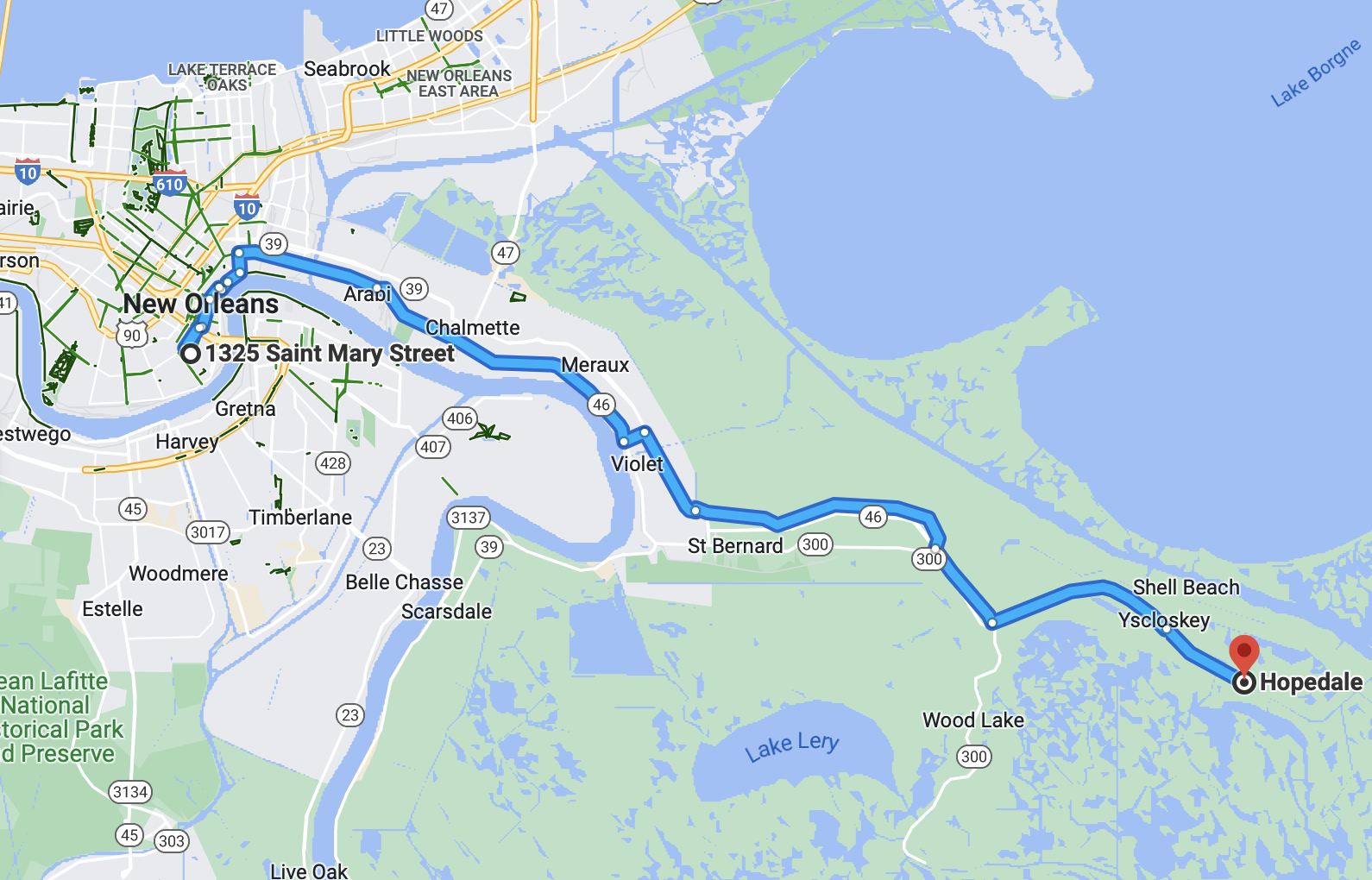 Over the course of a week I took two long bike rides on those dead end East Bank roads. For the first, I found on the map the town of Hopedale LA . It is in eastern St. Bernard Parish, about an hour’s car trip from our home in New Orleans. On March 5 Tootie drove me out to Hopedale LA so I could cycle back. Our car reached the end of the road. We stopped in the middle of the terminating highway.