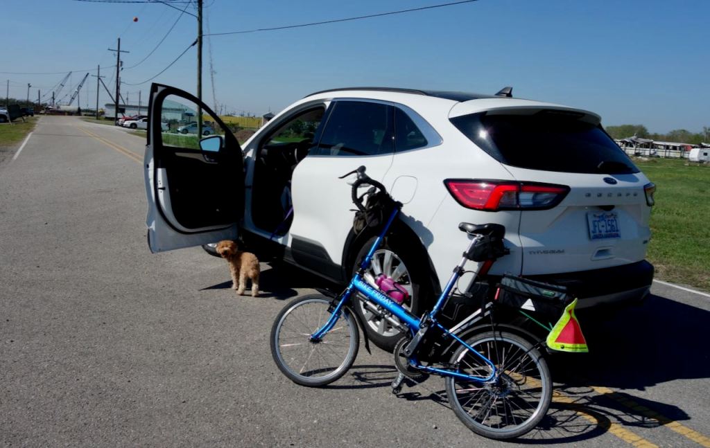 Tootie and Rosie got out to see me off. We pulled my bicycle out of the back of the car. It is a Bike Friday, New World Tourist model, a folding bicycle that I did not fold in this situation. I really like the way it rides on a smooth surface. It is less effective in the extremely bumpy city streets of New Orleans. (I use two other bicycles for city rides.)