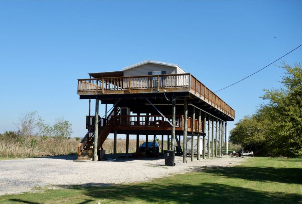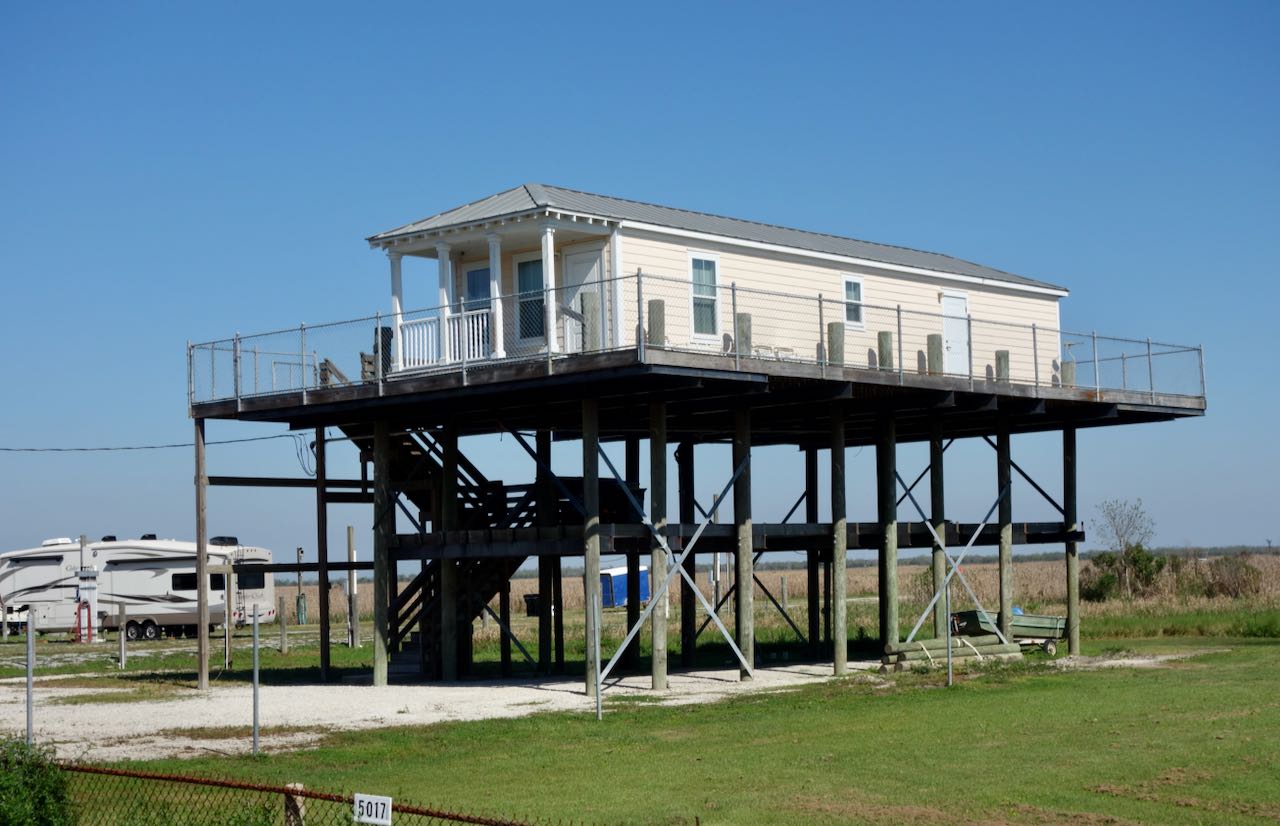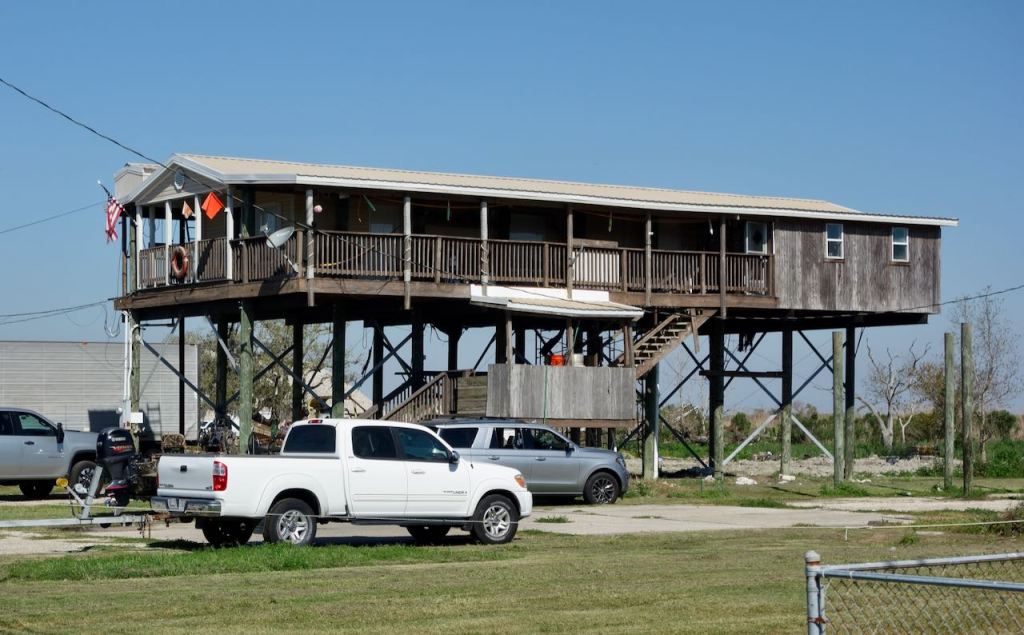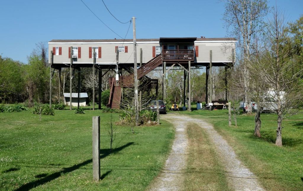 The majority of the population of St. Bernard Parish lives within levee protection. These levees still did not prevent huge flooding during Katrina even in those “protected” areas. However, out here in Hopedale and adjoining Shell Beach it is BEYOND levee protection. Many or even most buildings I saw this morning had been raised to astronomical heights. Some of these are second homes, which Louisianians call fishing camps. Many are primary residences; I honestly do not know which.