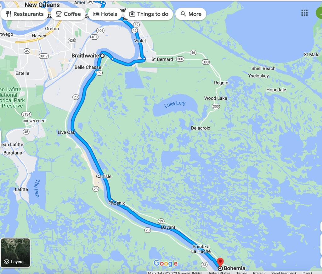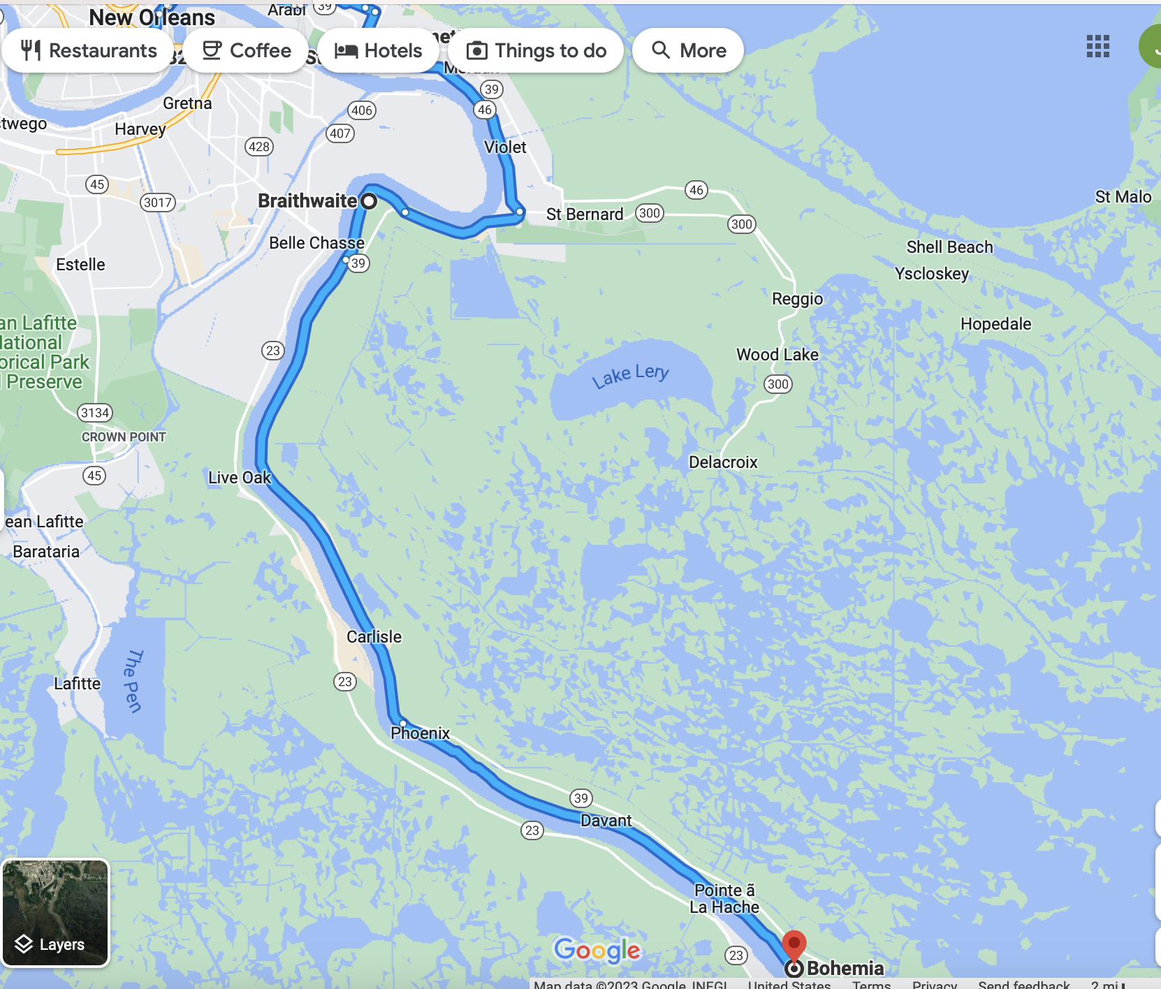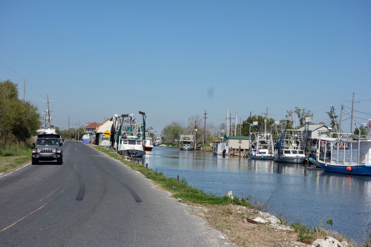 Louisiana geography is complicated. Divided by the Mississippi River, southern Louisiana has an East Bank and a West Bank, even though with a curving river the East Bank is not always to the east. In the swampy landscape south of New Orleans, on the East Bank there are roads that head out into the marshes, roads that just stop when they run their course. There is a similar situation on the West Bank but I will have to take that journey in another blog.