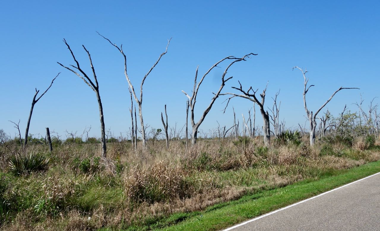 On a stretch through the marshes dead trees littered the landscape. I assumed they died because of salt water intrusion.