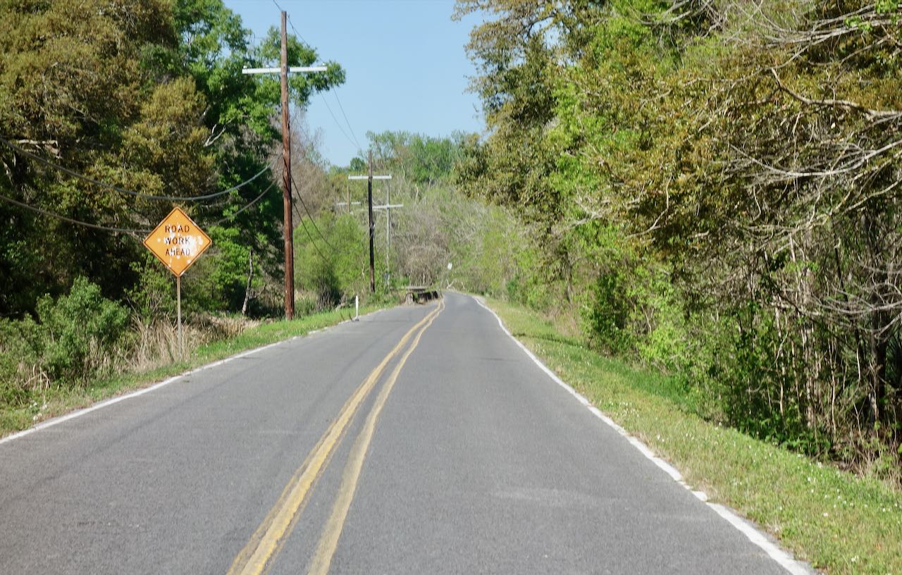 As a bicyclist for much of the way I was able to stay off busy roads as the population density increased. Highway 46 is paralleled by the older Bayou Road, which follows the former route of the Bayou waterway, the waterway itself having been relocated about a quarter of a mile away. At about the halfway point on Bayou Road the road is blocked. Either the road washed out in a flood and they never fixed it, or locals just like not having so much car traffic. A bicyclist can just climb around the barrier.
