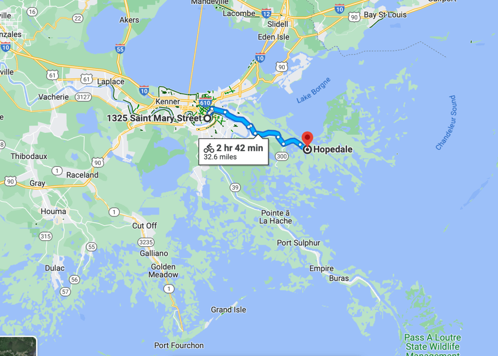 There is a highway on each side of the river as it flows south. I was attempting to cycle the East Bank highway as far as it went, a distance by road of about fifty-six miles from our New Orleans condo. As opposed to my previous trip, this time I would first bicycle downriver and to then call Tootie and Rosie to come pick me up.