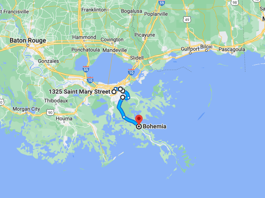 My map showed four miles more of a dead-end highway, with a “town” of Bohemia LA near the end. I had the road to myself. In my half hour of additional bicycle riding on this highway I only had one passing vehicle. Beyond were marshes devolving into the Gulf of Mexico.
