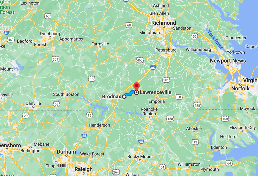Brunswick County has a countywide population of just 15,800; down from about 20,000 in 1950 and even down from the 16,400 in the year 1800! The county is currently 57% African-American. I did an up-and-back bike ride this certain Sunday; Brodnax VA to Lawrenceville VA.