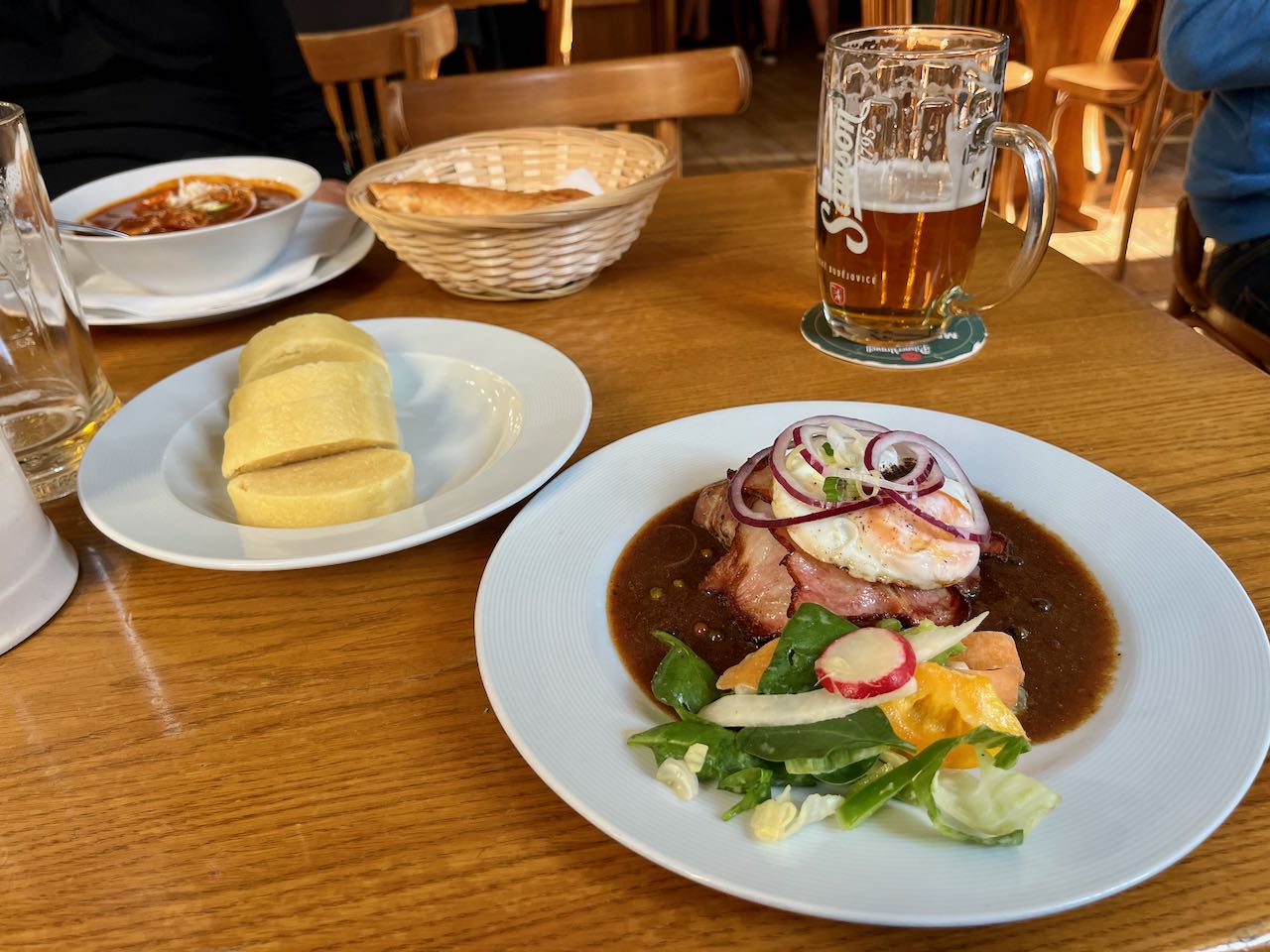 I ordered pork tenderloin in gravy with dumplings; Lyman had goulash with a side of bread. I learned on this trip that ” goulash” in this culture just means “stew.”