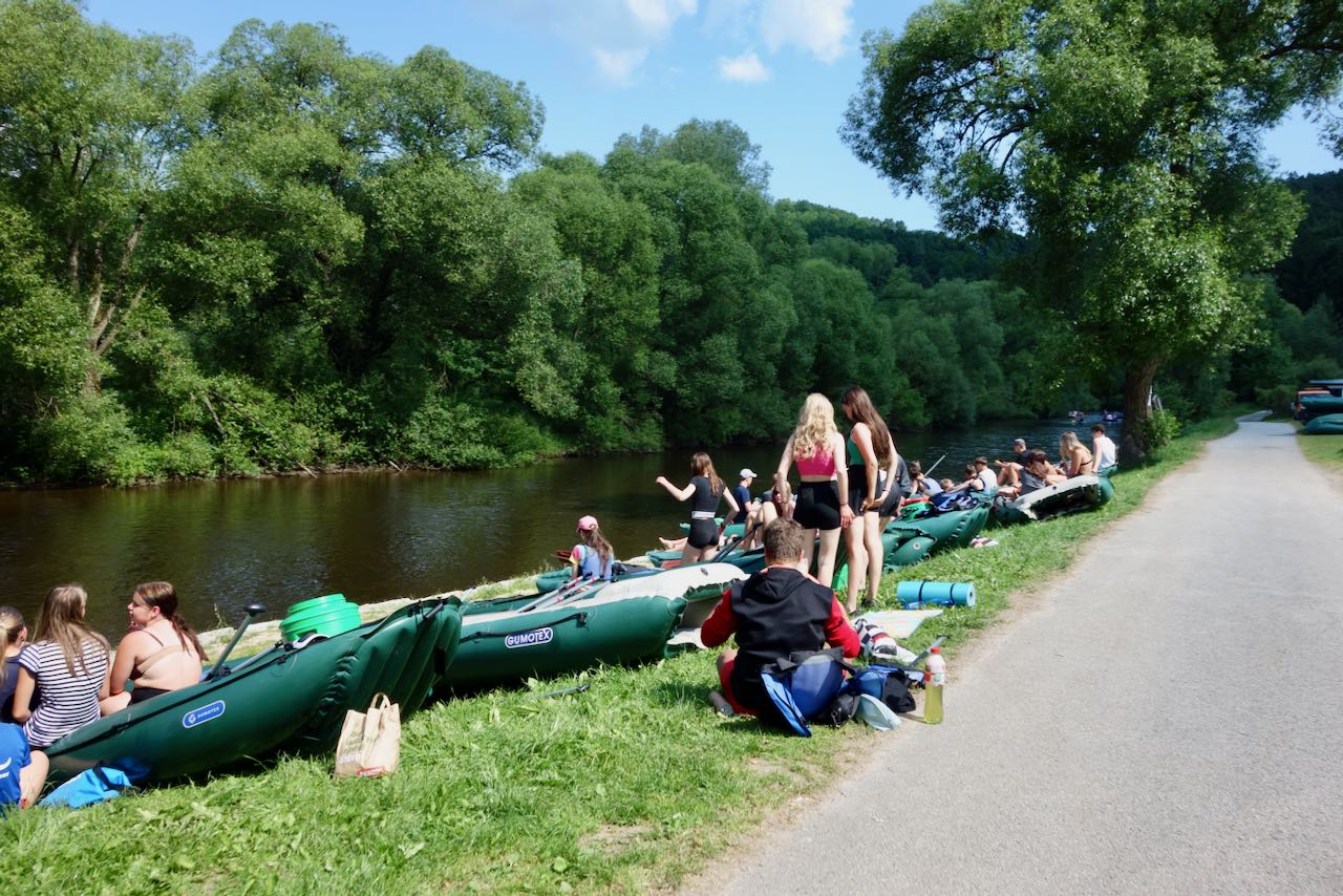 We had to bicycle away from Cesky Krumlov the same way we came, up and over that mountain on a steep rocky dirt road. Once back down the mountain we passed a group assembling for rafting on the river.
