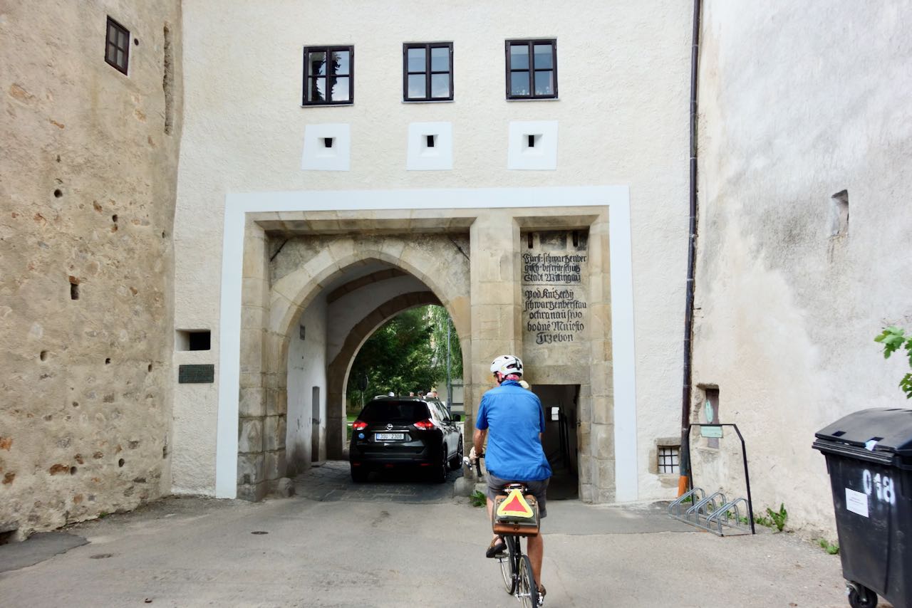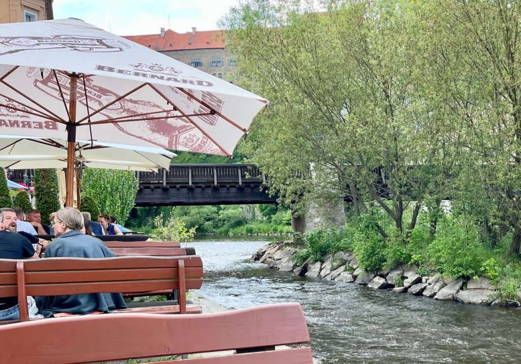 Cesky Krumlov (population 13,000) sits on the Vltava River surrounded by steep slopes on all sides. Unless we took the major highway we had to cycle up an intense incline on a bumpy gravel road, which went up and over what seemed like a small mountain. It was challenging. There was an equally steep but at least paved downhill as we descended into Cesky Krumlov at about 1:00 PM. We found a restaurant where we could get lunch. It straddled a very steep hill.
