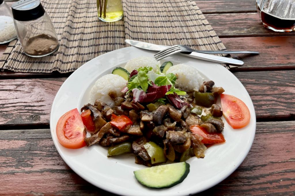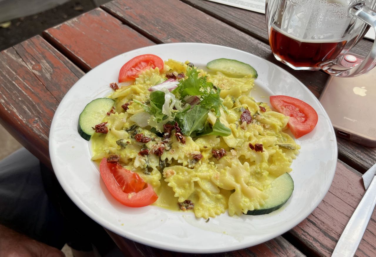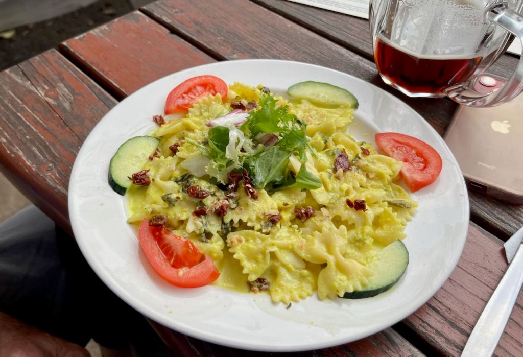 That evening for dinner once again we tried to be healthy. There was a vegetarian restaurant with seats outside by the river. Its proprietor is a glad-handing English speaking Czech guy. He does a good job, although when we left I still felt hungry!