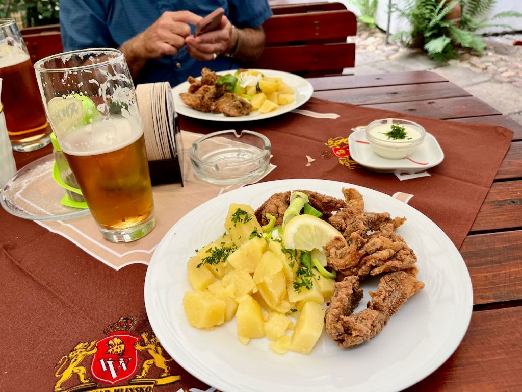 An unexpected development was that restaurants were all crowded with bicycle tourists, most of whom appeared to be part of organized groups. All the places to eat looked full but we found somewhere far off the street. Trebon is surrounded by lakes and the local speciality seemed to be fried fish. With potatoes and beer, or course. It rained really hard all during our meal and we had to keep changing seats, as the umbrellas overhead were leaking.